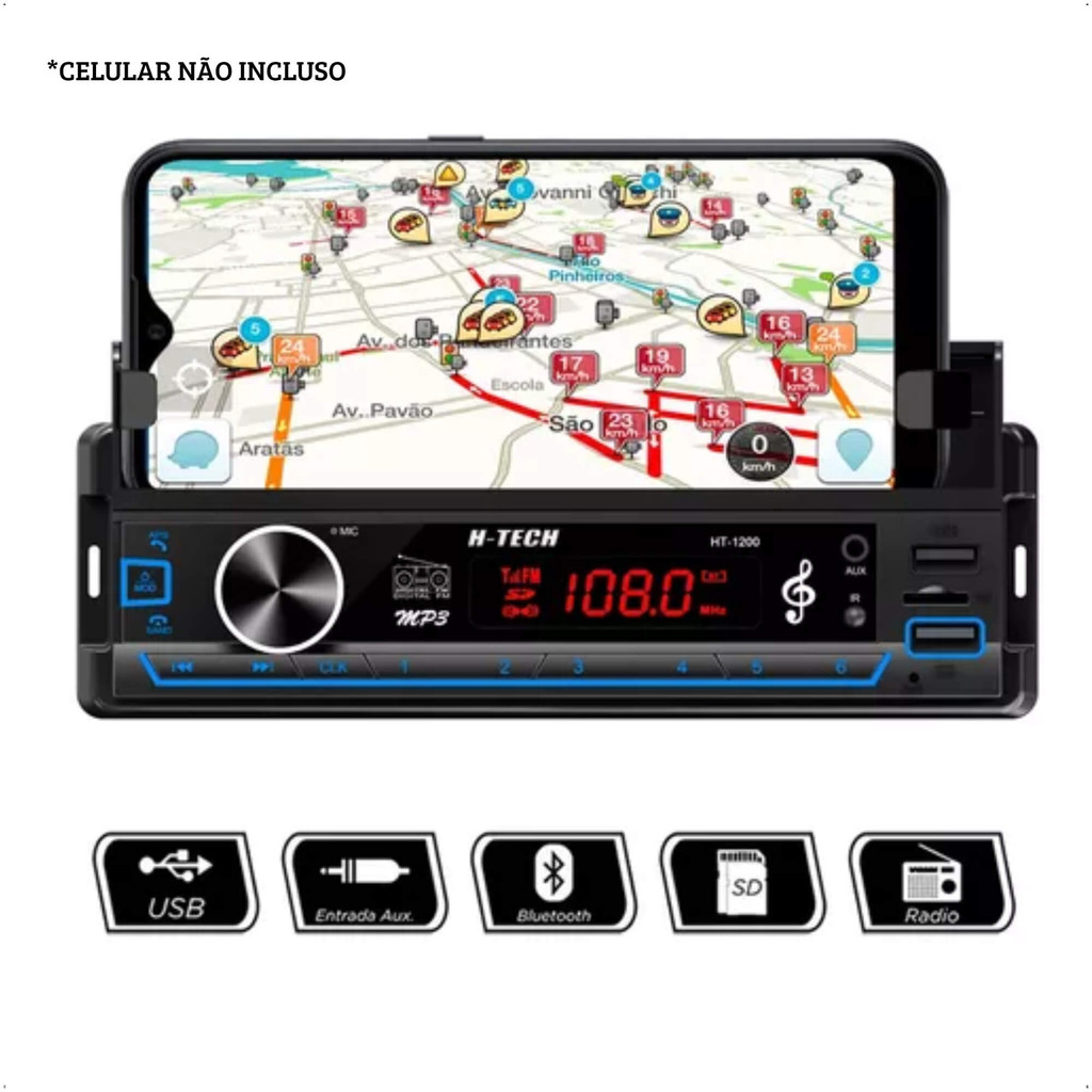 OBS: Não acompanha o Celular que aparece nas imagens. Modelo HT-1200 não possui App! Características - Entrada USB / SD Card / AUX - Bluetooth - Suporte para Celular - Função de rádio - Equalizador Flat, Pop, Classic, Rock - Potência: 4x60w RMS - 2 Saída de áudio RCA - Função para troca de pastas O som automotivo da H-tech modelo HT-1200 vai ser o seu melhor companheiro para aumentar o volume e desfrutar do caminho. Sempre pronto para você mergulhar na música que mais gosta e com o melhor som. Os seus passeios de carro serão mais divertidos! O rádio para carro 1 Din conta com conexão Bluetooth, você liga seu celular ao MP3 player automotivo e consegue ouvir as músicas salvas no smartphone ou em qualquer plataforma digital que seu celular disponha, além de realizar chamadas telefônicas. Tem entradas USB para pendrive e SD para cartão de memória, podendo reproduzir arquivos em formato MP3, WMA e WAV. O modelo também possui, rádio FM. Além disso ele conta com um diferencial muito util, trata-se do Suporte para celular embutido no rádio, conseguindo ficar celulares de até 17 centímetros de comprimento, esse diferencial trará ainda mais praticidade a quem estiver guiando o carro. Especificação: - Modelo: HT-1200 - Auto radio c/ suporte embutido - Display led - Painel fixo - USB 2.0 - Carregador USB 2.1 - SD Card 2.0 - Bluetooth - Entrada auxiliar - Mp3 /WMA - Suporta cartão e pendrive de até 32gb - Visor de relógio digital - Sintonização de rádio FM - Seleção de 18 estações FM - Equalização pop, rock, class e flat - Possui 4 canais de 25W RMS - Possui 2 saídas RCA Contéudo da Embalagem: - 01x Auto Rádio H-Tech HT-1200 - 01x Chicote - 01 Controle Remoto - Manual de instruções