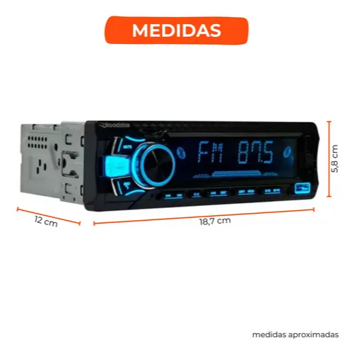 Radio Automotivo Roadstar RS-2751BR Plus – Conectividade, Personalizacao e Potencia Sonora Destaques Principais Visor e Botoes Iluminados em 7 Cores RGB Painel fixo e display em LCD com iluminacao personalizavel azul, azul claro, branco, amarelo, vermelho, roxo e verde para combinar com o estilo do seu carro. Radio FM e Memoria para 18 Estacoes Sintonia na faixa de 76 a 108 MHz com espaco para armazenar suas estacoes favoritas. Ajustes de Audio Personalizados Controle completo sobre graves, agudos e balanco para um som sob medida para voce. Conectividade Avancada Bluetooth para chamadas sem fio e streaming de musica direto do seu celular. Multiplas Entradas Frontais Micro SD, Auxiliar e 2 portas USB sendo uma para reproduzir midia e outra para carregar seus dispositivos. Potencia de Som Impressionante Sao 4 canais com 60 Watts RMS cada garantindo som forte, limpo e envolvente para suas viagens. Saidas RCA para Conexoes Extras Permite adicionar amplificadores ou outros componentes de audio tornando o sistema escalavel. Controle Remoto Fisico e via Aplicativo Facil operacao com controle remoto ou pelo smartphone utilizando o aplicativo CarLive disponivel para Android e iOS. O que Acompanha na Embalagem 1 Radio Automotivo RS-2751BR Plus 1 Controle Remoto 1 Chicote de Alimentacao ISO 1 Chicote de Audio ISO Manual do Usuario e Certificado de Garantia Por que voce vai gostar deste radio Visual personalizavel com iluminacao em 7 cores para harmonizar com o painel do carro Conectividade versatil com Bluetooth, Micro SD, USB e entrada auxiliar Potencia de 4x60W RMS proporcionando audio potente e de qualidade Controle pratico por meio de controle remoto ou aplicativo CarLive Resumo Tecnico Especificacao Iluminacao: RGB com 7 cores Radio FM: 76 a 108 MHz com memoria para ate 18 estacoes Ajustes de Audio: Graves, agudos e balanco dos canais Conectividade: Bluetooth, Micro SD, Auxiliar, 2 USBs Player e Charger Potencia: 4 x 60 W RMS Saidas RCA: 4 saidas para conexao de amplificadores Controle: Controle remoto fisico e aplicativo CarLive via Bluetooth Itens Inclusos: Radio, controle, chicotes, manual e certificado