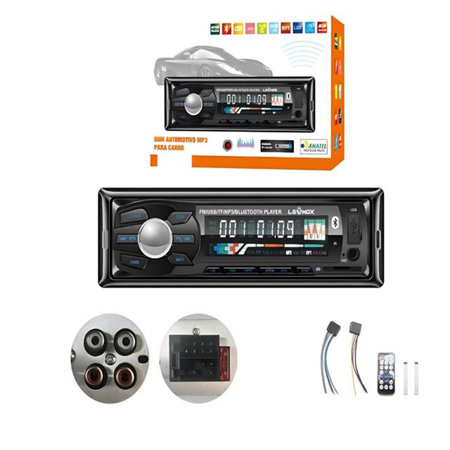 Especificações Técnicas: - Marca: Lehmox - Modelo: Ley-1854 - Tela: Digital LCD Display - Potência de saída: 50W - Tensão: 12V - Suporta formato de áudio: MP3 - Bluetooth: Sim - Material: Polipropileno - BT integrado (Opcional) - Sistema anti-sísmico eletrônico super forte - Vários modos de efeitos sonoros integrados(VOL/BAS/TRE/BAL/FAD) - Modos de reprodução: DVD/DIVX/MPEG4/VCD/MP3/WMA/CD/CD-R/RW - Recepção de rádio estéreo AM/FM Com slot USB/SD/MMC - É compatível com todos os modelos de carros? Sim, é compatível com qualquer carro que tenha alimentação de 12V. Itens Inclusos: 1 Rádio MP3 Bluetooth Ley-1854 1 Controle remoto 1 Chicote de instalação