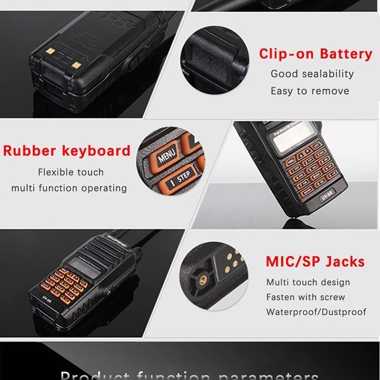 - Rádio produzido pela Baofeng, comunica com os modelos da Baofeng Linha UV, - Em todo território Nacional temos autorização para alteração comercial do nome, modelo e logotipo. - Resistente À água e poeira (Não resistente a mergulho) Radio comunicador de Alta potência/ Baixo selecionável -CTCSS e DCS -Função "Vox " -Função de bateria "salvar" -Emergência "SOS" som e luz de alarme -Programável por PC -Banda larga/banda estreita selecionável INFORMAÇÕES TÉCNICAS: - Modelo UV 9R -Faixa de frequência :VHF: 136-174 MHz UHF400-520MHz -Capacidade do canal: 128 -Espaçamento Entre canais: 25 KHz/12.5 KHz -Impedância da antena: 50O -Impedância do microfone: 600O -Tensão de funcionamento: 7.4 V DC±15 % -Estabilidade de freqüência: ±2. 5ppm -Bateria DC7.4 V ==5000 mAh (Polímero de Ions de Lítio) -Compatível Com Padrão Militar Americano (Mil-STD-810C/D/E). -Transmissor (EIA-RS 316B PADRÃO) -Potência De Saída RF: 10 W ITENS INCLUSOS: 1 x Radio comunicador UV9R 1 x Antena 1 x Bateria 5000 mAh Li-ion Battery 1 x Base p/ carregar o Rádio 1 x Clipe para cinto 1 x Fone de ouvido 1 x Alça de Mão Registration ID:67513-82-42724 Model Name:Radio Manufacturer:Guangzhou Ehang Intelligent Technology Co.