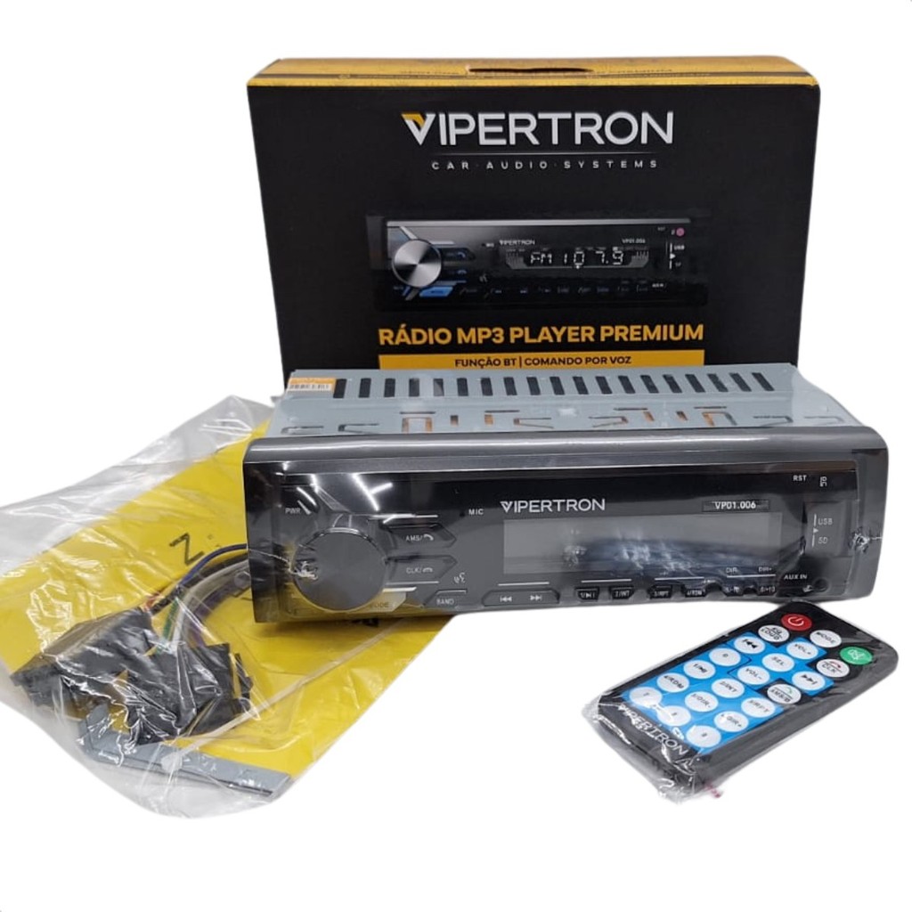 Rádio MP3 Player Vipertron Bluetooth/USB/SD/AUX/FM 4 x 45w - VP01.006 É um som automotivo completo que oferece alta potência de áudio, conectividade Bluetooth para streaming e chamadas, múltiplas entradas (USB, SD, AUX) para versatilidade de reprodução, e um sintonizador FM integrado, proporcionando uma experiência sonora de qualidade no seu veículo Especificações Técnicas: • Potencia Máxima: 4x45w RMS (4 OHms) • Impedância compatível: 4/8 Ohms • Relação Sinal/ Ruido: 65dB (Estereo) / 68dB(Mono) • Voltagem de Entrada: DC 12 a 14,4v • Conector: 12P • Bluetooth (com a Função E Way Link ) transforma seu Smartphone em Controle Remoto - consta no manual de instalação. • Comando por voz • Entrada USB • Entrada para cartão SD • Entrada para antena • Entrada AUX P2 • Bluetooth • Música no Smartphone- WPAN • Sincronismo automático Rádio FM • Reproduz MP3, WMA Player • Relógio Digital • Clock display • Volume eletrônico • Função de ESP de 45s • 4 saídas de 45W RMS (4 ohms) • 2 pares de saída RCA • Equalizador programado • Frente Fixa • Tecla Backlight em LED • Cor de iluminação Azul • Dimensões do console: 18,8 x 11x 5,8cm Conteúdo da Embalagem: • 01 Radio Mp3 Player • 02 Chicote de Instalação ( 16 vias ) • 01 Cinta Metálica • Manual e Certificado de Garantia Importante: • Garantia de 273 Dias. • Valor Unitário.