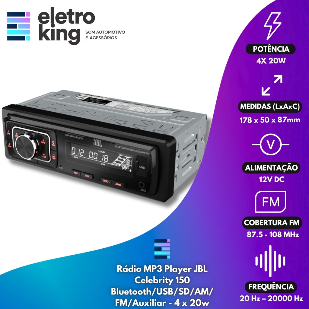 Seja bem-vindo a Eletroking, leia atentamente a descrição do produto abaixo antes da compra, qualquer dúvida, nos acione no campo de perguntas do anúncio. Rádio JBL Celebrity 150 Bluetooth/USB/SD/FM/Auxiliar + Par Alto Falantes JBL 5TRFX55 - 110 Watts Rms Transforme seu carro em uma experiência de som incomparável! O Rádio JBL Celebrity 150 combina tecnologia e estilo com frente destacável, Bluetooth, USB, SD e rádio AM/FM, garantindo praticidade e conectividade para suas playlists favoritas. Acompanham o kit os renomados alto-falantes JBL 5TRFX55, com 110W RMS (par), potência e clareza perfeitas para instalar no tampão traseiro. Qualidade que você merece, para dirigir com emoção e no ritmo da sua música preferida! Especificações Técnicas: • Fonte de alimentação: Rede a bordo 12 V CC • Potência de saída nominal: 4 x 20 W RMS • Fusível: 10 A • Resposta de frequência: 20 Hz a 20 kHz • Alcance de operação Bluetooth: até 10 metros • Perfis Bluetooth compatíveis: HFP, HSP, A2DP, AVRCP • Cobertura de frequência de rádio FM: 87,5 - 108 MHz • Dimensões de instalação (L x A x P): 178 × 50 × 87 mm • 30 estações predefinidas (18 FM / 12 AM) • Painel frontal destacável para prevenção de roubos • Múltiplas fontes de reprodução: Bluetooth, USB, AUX in, Cartão SD, Rádio AM e FM • Conector ISO (chicote de fiação incluído) • Função Relógio: Aperte o botão DISPLAY (DISP) para aparecer na tela do rádio. • Função TROCAR DE PASTA: Aperte e segure os botões 5 (para retroceder) e 6 (para avançar). Par de Alto Falantes 5 JBL FLEX4 5TRFX55 Triaxial - 110 Watts RMS • Potência Nominal: 55 Watts RMS • Resposta de Frequência @ -10 dB: 70 a 20000 H • Sensibilidade: 87 dB • Diâmetro Nominal: 133 (5) mm(in) • Impedância Nomina: 4 Ohms Conteúdo da Embalagem: • Rádio automotivo JBL Celebrity 150 • 02 Alto Falantes 5 JBL FLEX4 5TRFX55 Triaxial - 110 Watts RMS • 2 x Chicotes de fiação ISO • Ferramenta de remoção (chave) • Parafusos de fixação Importante: • Garantia de 273 Dias. • Valor do Kit. • Todos os Nossos Produtos São Novos, Originais e Acompanham Nota Fiscal. • A Eletroking recomenda que a instalação seja feita por profissional especializado e não se responsabiliza pelo mau uso do produto.