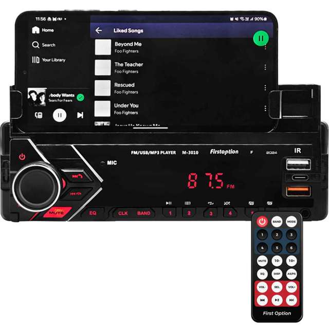 • Marca: First Option • Modelo: 3010F 2024 • Tamanho de montagem: 1 Din • Suporte para colocar celulares de até 16,3cm de altura • Cor: Preto • Potência por canal (RMS): 4x25W • Alimentação: 12V • Controle Remoto: Sim • Conexão Bluetooth • Frente: Fixa • Relógio: Sim • Iluminação dos Botões: Vermelho • Reprodução áudio: MP3 e WMA • Leitura de Arquivos por Pasta: Não • Loud: Sim • Modos Reprodução: Aleatório, Repetir • Opções de Equalização: Pop, Rock e Clássico • Memória para Estação: 18 FM • Frequência FM (MHz): 87,5 - 108 • Busca automática de Estações: Sim • Leitor de CD: Não • Entrada USB para transferir dados: sim • Entrada USB para carregar o celular: sim • Entrada SD: Sim, frontal • Entrada Auxiliar: Sim, frontal • Bluetooth para Ligações: Sim • Bluetooth para Músicas: Sim • Microfone: Sim (embutido) • Saída Áudio (RCA): 2 • Saída Sub (RCA): Não Itens inclusos • 1 Som Automotivo 3010F 2024 • 1 Chicote de alimentação • 1 Manual (em português brasileiro) • 1 Controle Remoto Observação Não é aceita a devolução em caso de instalação incorreta por parte do cliente, por consequência, recomendamos que a instalação seja feita por um profissional competente na área para evitar transtornos, é vital que o produto seja instalado no painel do veículo desejado utilizando exclusivamente o chicote da embalagem. Dito isso, sinta-se livre para resolver suas dúvidas no nosso chat.