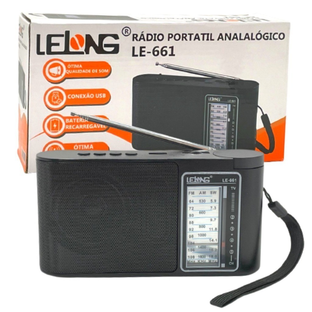 Temos uma grande variedade de produtos em diversas categorias para melhor atender às suas necessidades. RÁDIO PORTÁTIL ANALÓGICO LE-661 Modelo de rádio de mão que você pode ligar em 110v ou 220v através de uma fonte USB, (mesmo modelo de celular, que não acompanha), Possui bateria interna recarregável e pode ser usado com pilhas grandes também. Ótima sintonia das estações Entrada USB para Pen Drive Entrada Auxiliar tipo P2 para conectar o celular ou um MP3 Player Possui uma ótima qualidade ( Surpreenda-se) CARACTERÍSTICAS : - Bluetooth - Rádio AM/FM - Portátil - Pilha E Bateria Bivolt - USB Ótima Recepção - Master Rádio portátil Tamanho Médio: Altura : 11cm Largura: 19cm Espessura: 6cm Alça para facilitar o transporte Perfeito para ouvir musicas, notícias e jogos de futebol. Caso tenha algum problema com a sua encomenda, pedimos por gentileza, que primeiramente, entre em contato por mensagem e terá uma resposta em no máximo 2 horas uteis. As respostas das mensagens são mais rápidas que das reclamações (atendidas em até 24 horas.