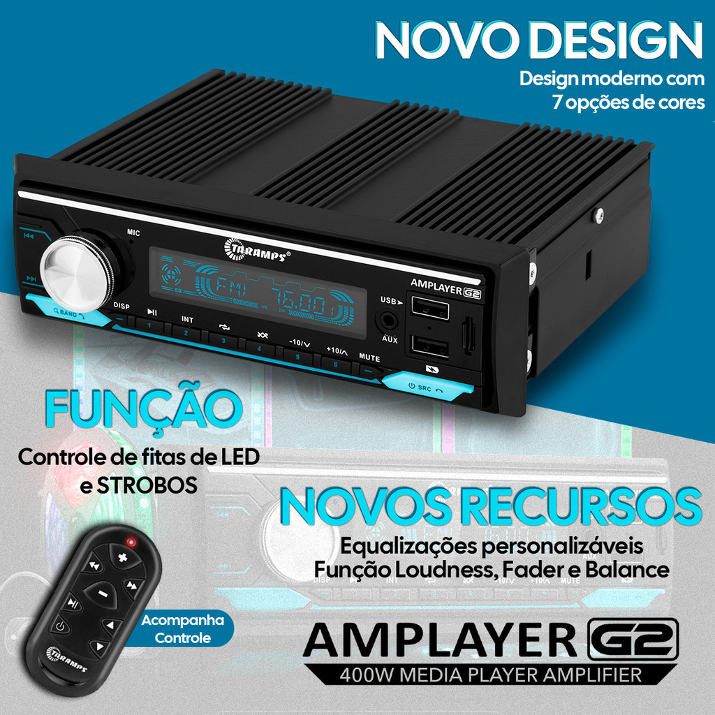 Kit Rádio Taramps Amplayer G2 Bluetooth USB SD + Par Alto-Falantes Bravox B3X50X 5 Polegadas Triaxial 50W RMS Cada Total 100Wrms do Par Tweeter Mylar A combinação ideal para quem valoriza potência, conectividade e qualidade sonora. O rádio automotivo Taramps Amplayer G2 oferece 4x100W RMS a 2 Ohms, Bluetooth 5.3, entradas USB e SD, viva-voz, além de controle remoto com longo alcance e recursos para iluminação RGB. Uma central de áudio e luz moderna, compacta e de fácil instalação. Acompanhando o kit, o par de alto-falantes Bravox B3X50X de 5 polegadas entrega potência real de 50W RMS cada, estrutura robusta e performance impressionante. Com cone de polipropileno, borda em santoprene, tweeter em Mylar e midrange integrados, proporciona áudio limpo, equilibrado e com excelente durabilidade. ESPECIFICAÇÕES DO RÁDIO TARAMPS AMPLAYER G2 Potência: 4x100W RMS a 2 Ohms ou 2x200W em bridge a 4 Ohms Bluetooth 5.3 com viva-voz integrado Entrada USB dupla, cartão SD e rádio FM (76 a 108 MHz) Iluminação frontal com 7 cores Crossover integrado: passa-baixa, passa-alta, full range Equalizador gráfico, loudness, fader e balance Saída RCA 2V RMS Saída remote de 1,5A Saídas RGB para fitas LED (23 efeitos integrados) Porta USB para carregamento (1A) Controle remoto incluso Compatível com padrão 1 DIN ESPECIFICAÇÕES DO PAR DE FALANTES BRAVOX B3X60X Tamanho: 5 polegadas Potência RMS: 50W por unidade | 100W máx Impedância: 4 Ohms Sensibilidade: 89 dB/W/m Resposta de frequência: 70Hz – 20kHz Cone: Polipropileno injetado (leve e resistente) Borda: Santoprene (alta durabilidade) Bobina: Corpo em alumínio (dissipação térmica) Tweeter: Mylar Midrange: Integrado Design: Triaxial (melhor distribuição de som) Ímã: De fluxo magnético para estabilidade sonora Diâmetro: 130 mm | Altura: 47 mm CONTEÚDO DA EMBALAGEM 1 Rádio Taramps Amplayer G2 2 Alto-falantes Bravox B3X50X 5" 1 Chicote de ligação 1 Controle remoto 1 Manual de instruções