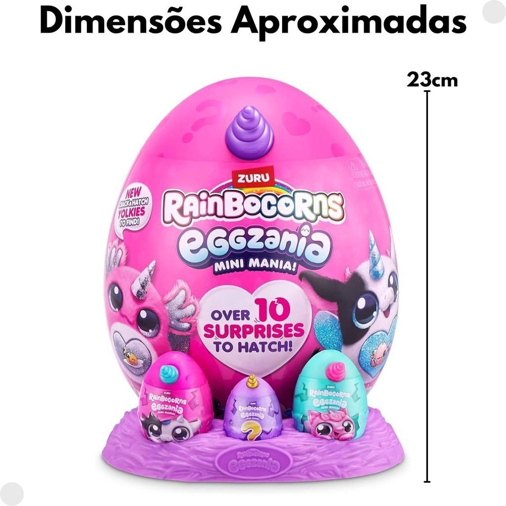 DESCRIÇÃO DO PRODUTO: Os Rainbocorns Eggzania Mini Surprise Series1 trazem a diversão das surpresas em um ovo mágico! Ao abrir o ovo, você encontrará um lindo e macio bichinho de pelúcia Eggzania, acompanhado por um adorável Yolkie e 3 mini ovos com surpresas incríveis. Com esses fofinhos e divertidos Rainbocorns, você terá companheiros de bolso perfeitos para brincar e se divertir. Os Yolkies adoram se aconchegar e podem ser presos às surpresas dentro dos ovos. Os Rainbocorns Eggzania Mini Surprise Series1 são ideais para presentear crianças acima de 3 anos. Elas vão adorar a experiência de abrir o ovo e descobrir todas as surpresas dentro dele. CARACTERÍSTICAS TÉCNICAS: Conteúdo da Embalagem: 10 Peças / 01 Pelúcia / 01 Base de Ninho / 01 Ovo Grande / 01 Pacote de Slime / 01 Pacote de Miçangas / 01 Cordão / 13 Adesivos / 01 Guia de Colecionador. Dimensões Aproximadas da Embalagem: 18cm x 21cm x 24cm (Altura x Largura x Comprimento/Profundidade) Material/Composição: Plástico Idade Mínima Recomendada: A partir de 3 anos Participantes: A partir de 1 pessoa Alimentação: Não se aplica Marca: Fun Referência: F0149-9B Outras informações: As cores podem variar entre as imagens mostradas acima e o produto. Imagens meramente ilustrativas. Aviso: As informações e imagens divulgadas são de total responsabilidade do fabricante/fornecedor. Produto lacrado e disponível a pronta entrega para todo Brasil! APROVADO PELO INMETRO