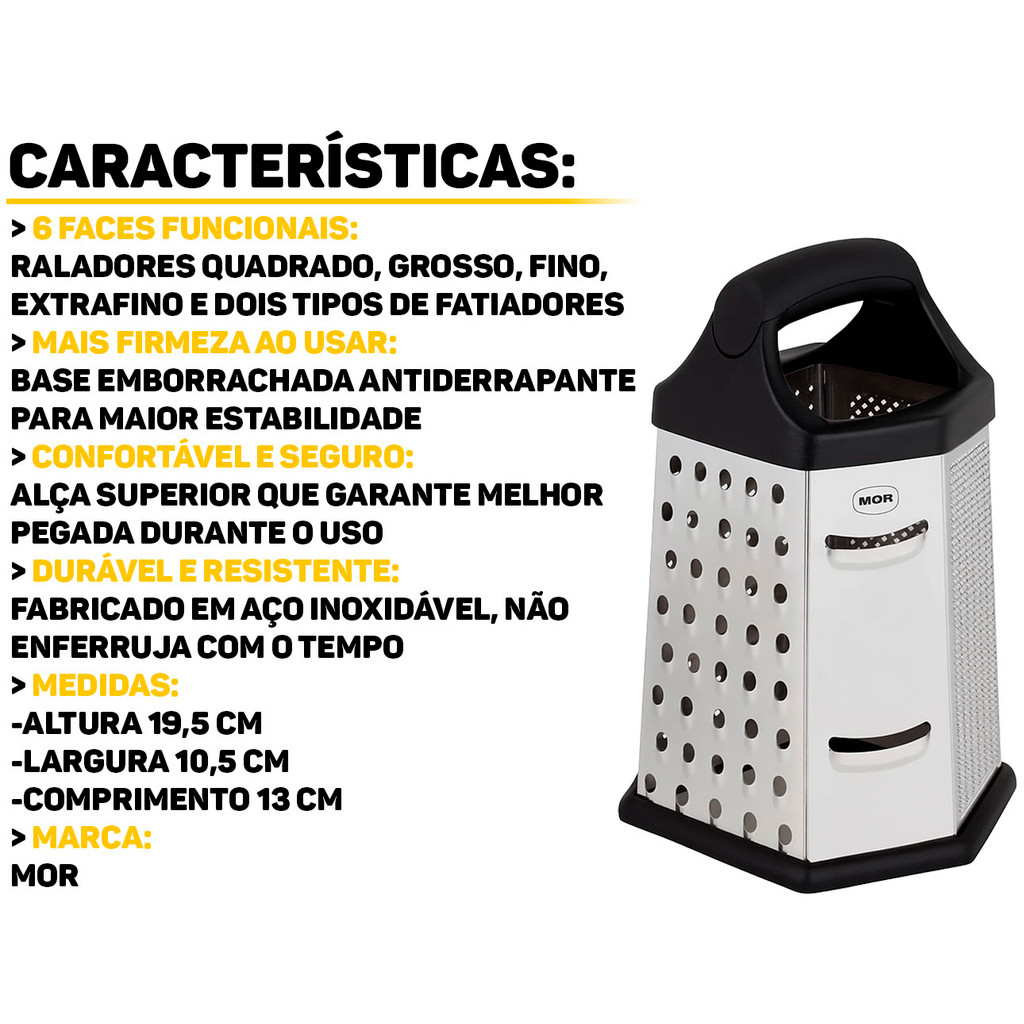 Ralador Multiuso 6 Faces Mor Versátil, prático e indispensável na sua cozinha! O Ralador Multiuso 6 Faces Mor é a solução ideal para facilitar o preparo das suas receitas. Com seis diferentes superfícies de corte, ele permite ralar, fatiar e triturar uma grande variedade de alimentos. É firme ao utilizá-lo, já que possui base antiderrapante emborrachada. Além disso, possui alça na parte superior que melhora a sustentação e o conforto. Compacto e funcional, é perfeito para o dia a dia. Características: > Fácil de limpar e manusear; > Compatível com lava louças; > Possui base antiderrapante emborrachada; > Produzido em aço inoxidável, é resistente à corrosão; > Conta com quatro tipos de raladores (quadradas, grosso, fino e extrafino) e dois tipos de fatiadores, normal e ondulado. Especificações Técnicas: > Material: aço inoxidável; > Dimensões do produto (C x L x A): 13cm x 10,5cm x 19,5cm. - Marca: Mor - Garantia: 90 dias contra defeitos de fabricação Vantagens de comprar na Brester: - Produto a pronta entrega. - Produto novo, com garantia de fábrica. - Nota fiscal para Pessoa Física e Pessoa Jurídica.