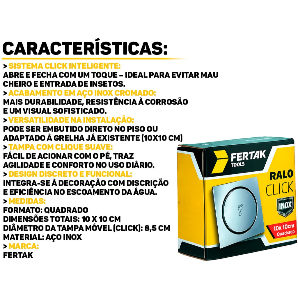 Ralo Click Inox Quadrado 10X10 Cm Fertak O Ralo Click em Inox Fertak, versátil e moderno, é ideal para aplicação em banheiros, lavabos, sacadas e lavanderias. Seu grande diferencial está na tecnologia click-up, que permite abrir e fechar o ralo com apenas um toque , unindo funcionalidade, higiene e praticidade no dia a dia. Além disso, o acabamento em inox garante durabilidade, resistência à corrosão e um visual sofisticado para o ambiente. Características: > Sistema Click-Up: abre e fecha com um simples toque; > Instalação fácil e rápida; > Design moderno e discreto; > Evita odores e entrada de insetos; > Ideal para ambientes úmidos: banheiro, lavabo, sacada e lavanderia; > Fabricado em aço inox resistente à corrosão. Especificações: > Sistema Click-Up (abre/fecha com um toque); > Material: Aço Inoxidável. - Marca: Fertak - Garantia: 90 dias contra defeitos de fabricação Vantagens de comprar na Brester: - Produto a pronta entrega. - Produto novo, com garantia de fábrica. - Nota fiscal para Pessoa Física e Pessoa Jurídica.