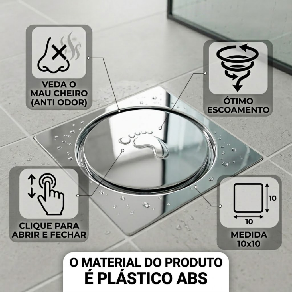 Ralo Click Inteligente em Plastico ABS 10x10 Cromado Preto Branco Piso Banheiro Quadrado Redondo