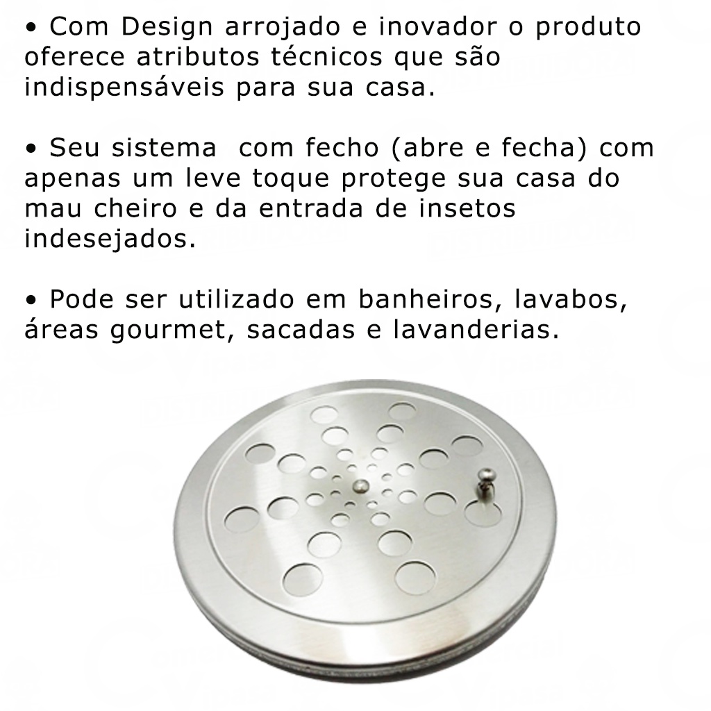 COMERCIAL VIPASA DISTRIBUIDORA. Ralo Grelha Inox Grande E Pequeno Redondo Abre Fecha Sem Caixilho 10X10cm Ou 15x15cm Veda Mal Cheiro Ralo Grelha Inox Redondo Abre e Fecha Sem Caixilho 10 x 10 - 15 x 15 Com Design arrojado e inovador o produto oferece atributos técnicos que são indispensáveis para sua casa. Seu sistema com fecho (abre e fecha) com apenas um leve toque protege sua casa do mau cheiro e da entrada de insetos indesejados. Pode ser utilizado em banheiros, lavabos, áreas gourmet, sacadas e lavanderias. Um produto de fácil instalação e ótimo custo benefício. - Sistema ABRE E FECHA: - Prevenção contra Odores; - Prevenção contra Insetos; Tamanho: 10x10 15x15 - Sem Caixilho COMERCIAL VIPASA DISTRIBUIDORA.