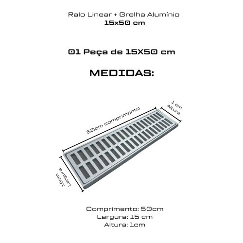 Acompanha: 1 grelha de 50 cm + 1 suporte de 50 cm Características e especificações: Marca: universal Medidas: 1 peça 15x50 cm Material: Alumínio. Desenvolvidas para serem instaladas em sequência para formar a medida que necessária para a sua obra! - SUPORTA PASSAGEM DE VEÍCULOS DE GRANDE PORTE - SUPORTA PASSAGEM DE PEDESTRES - DE FÁCIL E RÁPIDA INSTALAÇÃO - NÃO ENFERUJA JAMAIS Vantagens: - Não enferruja; - Fácil nivelamento do piso; - Maior área de captação de água; - Fácil instalação; - Design diferenciado, com grelha no modelo vazado; - Praticidade na limpeza, fácil acesso a parte interna do ralo. Sugestões de uso: - Garagem; - Corredor; - Área de lazer; - Ao redor de piscinas; - Na casa de campo; - Em bares e restaurantes. ATENÇÃO: Procura outro modelo ou medidas? Envie-nos uma mensagem no campo “Perguntas”. Temos outros anúncios com diferentes tipos de kits, consulte em “Ver mais anúncios do vendedor” Ficaremos felizes com sua visita. Antes de efetuar a compra verifique se o produto atende suas necessidades. Temos como foco principal proporcionar uma boa experiência de compra ao cliente. Nossa prioridade é lhe garantir uma compra agradável, oferecendo produtos de qualidade, entrega com agilidade e segurança. Boas Compras! GARANTIA: Enviamos os produtos bem embalados. Todo o produto tem garantia de troca/devolução dentro de sete dias após o recebimento, e a garantia do fabricante são de 90 dias após o receber o produto. AGILIDADE: Temos produto à pronta entrega. Enviamos no mesmo dia, seu produto já estará na transportadora. *Emitimos NF-e para CNPJ e CPF em todas as nossas vendas. **Nossos envios são imediatos.