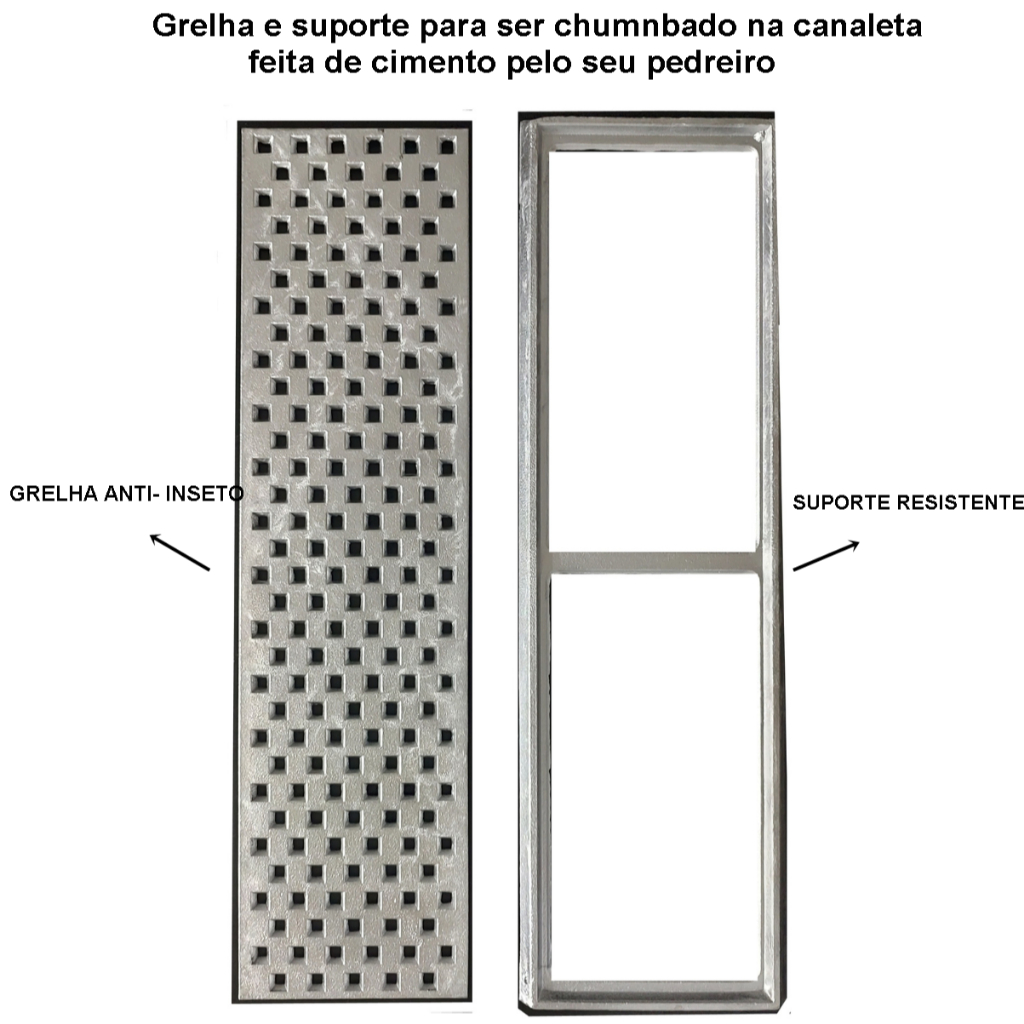acompanha : 1 grelha anti-inseto de 50 cm + 1 suporte de 50 cm Desenvolvidas para serem instaladas em sequência para formar a medida que vc precisa em sua obra em peças de 50cm em 50cm ... - GRELHA ANTINSETO ( NAO PASSA INSETOS , ROEDORES , ESCORPIÃO ) - SUPORTA PASSAGEM DE VEICULOS - NÃO CORTA OS PÉS - NAO ENFERUJA - INSTALAÇAO FACIL E RAPIDA Características e especificações: Marca: RR FUNDIÇÃO LTDA Medidas: comprimento : 50cm largura : 20cm altura : 1cm Material: Alumínio