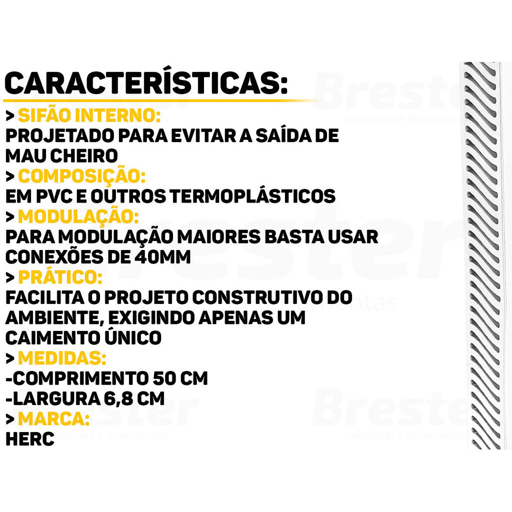 Olá, Bem vindo a Distribuidora Brester. Trabalhamos com uma grande variedade de ferramentas elétricas e manuais, descartáveis, eletroeletrônicos, artigos para casa, artigos de petshop e outros. Aqui você encontrará Produtos Originais, Nota Fiscal, Pronta Entrega e Envio Imediato! Informações do Produto: Ralo Linear Modulável 500mm Herc Você já imaginou ter um sistema de escoamento de água que une praticidade, design e eficiência? O Ralo Linear Modulável é perfeito para você! Acabe com preocupações de acumulação de água. Este ralo proporciona uma drenagem eficiente, mantendo seu ambiente sempre seco. Características: > Sifão interno que evita odores; > Possibilidade de extensão modulável combinando com o modelo de 70cm; > Facilita o projeto construtivo do ambiente, exigindo apenas um caimento único. Especificações Técnicas: > Saída para conexões com bolsa DN 40; > Material: PVC (corpo do ralo) e outros termoplásticos (demais componentes). - Marca: Herc - Garantia: 12 meses contra defeitos de fabricação Vantagens de comprar na Brester: - Nota fiscal para Pessoa Física e Pessoa Jurídica; - Produto novo, com garantia de fábrica; - Produto a pronta entrega; - Envio em até 24hs em dias úteis após confirmação do pagamento. Obrigado por escolher a Brester Máquinas.