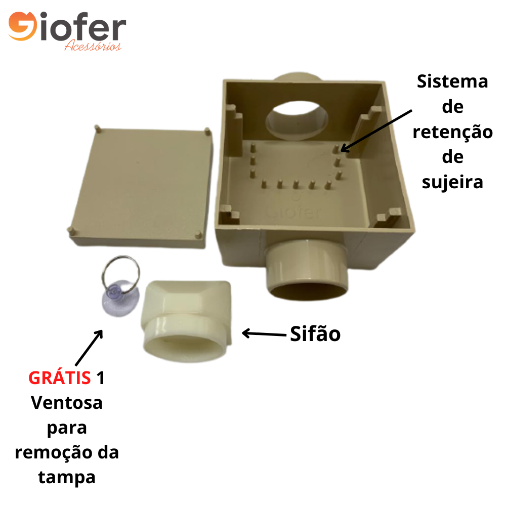 RALO SIFONADO INVISÍVEL Marca: GIOFER Com o intuito de solucionar tais inconvenientes e proporcionar melhorias funcionais, após vários estudos e pesquisas foi desenvolvido o inusitado Ralo Sifonado Invisível com 100 x 63mm com saída lateral Ø50mm e entrada uma lateral OPCIONAL Ø40mm. O ralo sifonado invisível, possui uma tampa superior que recebe o revestimento do próprio piso, não interferindo na estética do ambiente. Contem uma caixa coletora com altura de 63mm, o que proporciona maior captação de água, esta caixa é provida de pinos em sua base, que retém a sujeira e facilita a limpeza, desta forma evitando que a sujeira vá diretamente para o encanamento. A saída com Ø50mm proporciona uma melhor vazão de água. Dotado de uma entrada opcional lateral de Ø40mm para uso, se necessário, de acordo com a instalação. Sendo fabricado em ABS. Compreendido por tampa de formato quadrado onde será instalado o próprio piso/revestimento no seu interior, sendo a tampa provida de quatro pinos posicionadores em sua parte inferior, dotado de caixa coletora de formato quadrado com dimensões de 100 x 100mm e altura de 63mm, possui também pinos em sua base posicionados de forma equidistante que servem para reter sujeiras maiores e fios de cabelos, uma de suas faces laterais possui uma entrada opcional, para tubo de 40mm que pode ser utilizada de acordo com a necessidade da instalação, a lateral oposta possui uma saída de Ø50mm, local onde será montado o sifão para o sistema anti-cheiro. Marca: GIOFER.