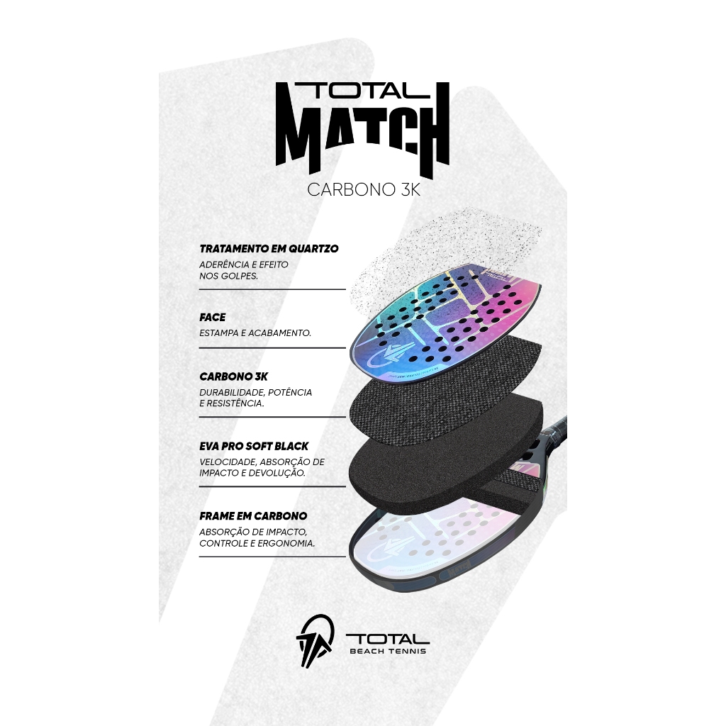 CHEGOU A NOVA TOTAL MATCH 2025 – INOVAÇÃO, DESEMPENHO E ESTILO Domine as quadras com o equilíbrio perfeito entre potência e controle! A nova Raquete Beach Tennis Carbono 3k Total Match combina tecnologia avançada com um design exclusivo e holográfico brilhante, garantindo que você jogue em alto nível com um estilo único. Se você quer elevar seu desempenho e ainda se destacar com um visual inovador, esta raquete é para você! BENEFÍCIOS EXCLUSIVOS: CARBONO 3K PREMIUM – Performance Profissional: Produzida com carbono 3k de última geração, a Total Match oferece uma estrutura leve, resistente e durável, ideal para golpes precisos e potentes. Seja nas jogadas de ataque ou defesa, você sentirá a diferença de uma raquete feita para todos os níveis de jogador. DESIGN Holográfico Brilhante e Exclusivo: Com um acabamento holográfico inovador, esta raquete brilha com intensidade sob a luz, criando um efeito visual impactante e elegante nas quadras. Não é apenas uma raquete de alto desempenho – é um item de estilo. CONTROLE E POTÊNCIA EQUILIBRADOS: O carbono 3k proporciona a leveza e agilidade que você precisa para se movimentar rapidamente, sem abrir mão da potência nos golpes. Aproveite o máximo controle com um toque de explosão para finalizar seus pontos! CAPA EXCLUSIVA: Para proteger e transportar sua raquete com praticidade e estilo, você leva uma capa exclusiva da Total Beach Tennis totalmente grátis. CARACTERÍSTICAS DO PRODUTO: MATERIAL DE FABRICAÇÃO: Carbono 3K COMPOSIÇÃO DO FRAME: 100% em carbono com sistema antivibração reforçado NÚCLEO: EVA PRO PESO MÉDIO: 325g BALANCE: Equilibrado COMPRIMENTO: 50cm ESPESSURA: 22mm FUROS: 48 ACABAMENTO: Vem com tratamento de fábrica na face, com grãos de quartzo CAPA PROTETORA: Sim, acompanha capa de brinde exclusiva da Total GARANTIA DE 1 ANO: confiamos e garantimos a qualidade de nossos produtos, assim todas as raquetes da Total possuem 1 ano de garantia NOTA FISCAL: todos os nossos produtos são originais da nossa própria marca e emitimos nota fiscal para todas as vendas. Por que comprar agora? EXCLUSIVIDADE E ESTILO: Com o design holográfico inovador, você terá uma raquete que não só melhora o seu desempenho, mas também atrai todos os olhares nas quadras. OFERTA LIMITADA: Leve para casa uma raquete com a tecnologia mais recente em carbono 3k e ainda ganhe uma capa exclusiva como brinde – não perca essa oportunidade única! Clique em “Comprar agora” e transforme o seu jogo com a Raquete Beach Tennis Carbono 3k Total Match. Envio rápido e seguro para todo o Brasil! PERGUNTAS FREQUENTES: Qual é o prazo de envio? R: Envio imediato, em até 24 horas após confirmação da compra. O produto é original? R: Todos os produtos vendidos por nós são da nossa própria marca, Total Beach Tennis, e acompanha Nota Fiscal. Possui garantia? R: Sim, todos os produtos da Total Beach Tennis possuem garantia de fábrica, basta nos chamar no chat para conversar que resolveremos qualquer problema. Qual é a diferença entre as raquetes 3k, 12k, 18k? R: Os termos 3k, 12k, 18k significam a quantidade de carbono existente na face da raquete, por exemplo: 3k significa que a face da raquete possui 3 mil fios de fibra de carbono, 12k são 12 mil fios e assim por diante. Quanto maior a quantidade de carbono na raquete, mais rígida se torna a raquete, mais resistente, e assim costumam entregar maior controle nos jogos. Qual a diferença entre EVA Soft (macio) e Hard EVA (duro)? R: Na prática, o EVA é a espuma que vai no interior da face da raquete, sendo o EVA Soft um modelo mais macio, que faz a bola gerar mais potência por ter maior elasticidade, enquanto o Hard EVA é mais firme, trazendo maior controle do que potência. Qual é o balance das raquetes da Total Beach Tennis? R: O balance dos nossos modelos estão entre 25cm e 26cm no centro da raquete, ou seja, é um balance médio, bem equilibrado. Qual é a diferença de uma raquete com mais ou menos furos? R: Quanto mais furos na face da raquete, maior a flexibilidade do material, sendo assim você ganha mais potência. Enquanto com menos furos, você ganha maior controle de jogo nos golpes. O que significa tratamento na raquete? R: Todas as raquetes da Total Beach Tennis vem com tratamento de fábrica, o que significa que vem com grãos de quartzo na face da raquete, algo parecido com uma areia, para gerar efeito, assim a batida nas bolas em jogadas como o saque e o smash, pegam mais efeito, dificultando para os adversários. As raquetes da Total Beach Tennis vem com capa? Sim, todas as raquetes vem com capa para você guardar melhor sua raquete. CUIDADOS COM SUA RAQUETE: Após o término da sua partida, não se esqueça de passar um pano (uma opção é usar detergente neutro ou apenas pano umedecido) e em seguida guardar a raquete em sua capa ou raqueteira para transporte. Evite deixar a raquete exposta ao sol, a altas temperaturas e também em contato com a chuva/água. Seque bem a raquete antes de guardar. Ah, e se for comemorar com o parceiro, evite