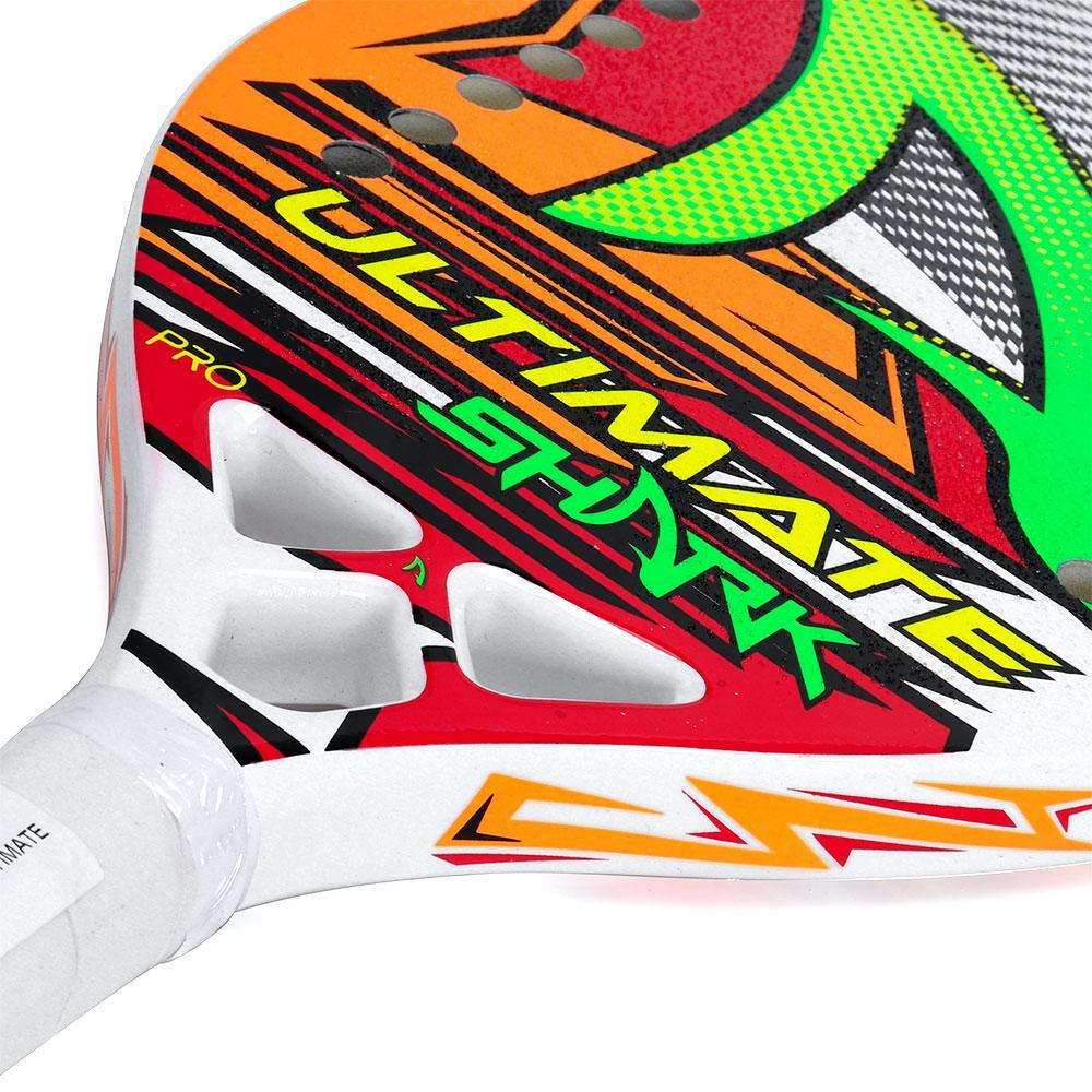 Descrição da Raquete de Beach Tennis Shark Ultimate A Shark é uma das marcas referência no mundo do Beach Tennis, conta com uma ampla linha de raquetes de todos os níveis e sempre com excelente qualidade. Um exemplo disso é a Raquete de Beach Tennis Shark Ultimate, ela foi desenvolvida com tecnologia EVA Soft. Conheça as Características da Raquete de Beach Tennis Shark Ultimate - Perfil: Intermediária/Avançado; - Coleção: 2022; - Composição: Estrutura: Carbono. Superfície: Fibra de Vidro. EVA: Soft; - Tecnologia: EVA SOFT: É composta de material com elasticidade e leveza, proporcionando maior potência, conforto, durabilidade e permitindo uma boa absorção de vibração nas jogadas. TUBULAR TECH: Estrutura que auxilia na redução das vibrações; - Detalhamento: Possui uma pintura com tratamento microgrânulos que ajudam a gerar efeitos, contém 14 furos, balanço equilibrado, acompanha capa; - Comprimento: 50 cm; - Peso Aproximado: 330 - 360g; - Espessura: 22 mm; - Garantia do Fabricante: 90 dias contra defeito de fabricação; - Origem: Importado.