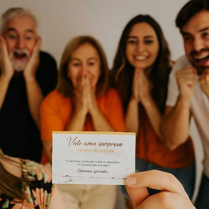 👶✨ Kit de Raspadinhas Revelação de Gravidez 🎉 Surpreenda amigos e familiares com uma revelação criativa, emocionante e cheia de charme! 💌 O que é: Cartõezinhos estilo raspadinha personalizados com a revelação da gravidez o. Uma forma divertida e inesquecível de compartilhar essa notícia tão especial! 🎨 Detalhes do produto: Tamanho: 8 cm x 6 cm Papel: Fotográfico 180g de alta qualidade Impressão colorida com acabamento premium 🪄 Como funciona: A pessoa raspa o espaço indicado e descobre a surpresa! 💡 Ideal para: Chá de revelação, surpresa para familiares, amigos, padrinhos ou mesmo para o parceiro(a)! 💖 Uma revelação inesquecível começa com um toque de criatividade. Encante com estilo!