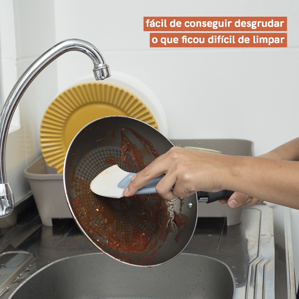 Esse é o raspador para limpeza da OIKOS. Esse aqui remove resíduos sem arranhar nenhuma panela! Sabe aquele ovo mexido feito de manhã e esquecido na frigideira em cima da pia? É só raspar o silicone na superfície com um pouco de água para conseguir desgrudar o que ficou difícil de limpar. Um lado é de silicone mais resistente, para raspagens mais fortes. O outro, mais mole e fino, o que ajuda a limpar os cantinhos mais difíceis. ":: fácil de limpar: utilize um pano macio levemente umedecido. :: fácil de lavar: pode ser lavado na água corrente com esponja. para eliminação de bactérias é só lavar com água quente ou lavar com sabão neutro. "
