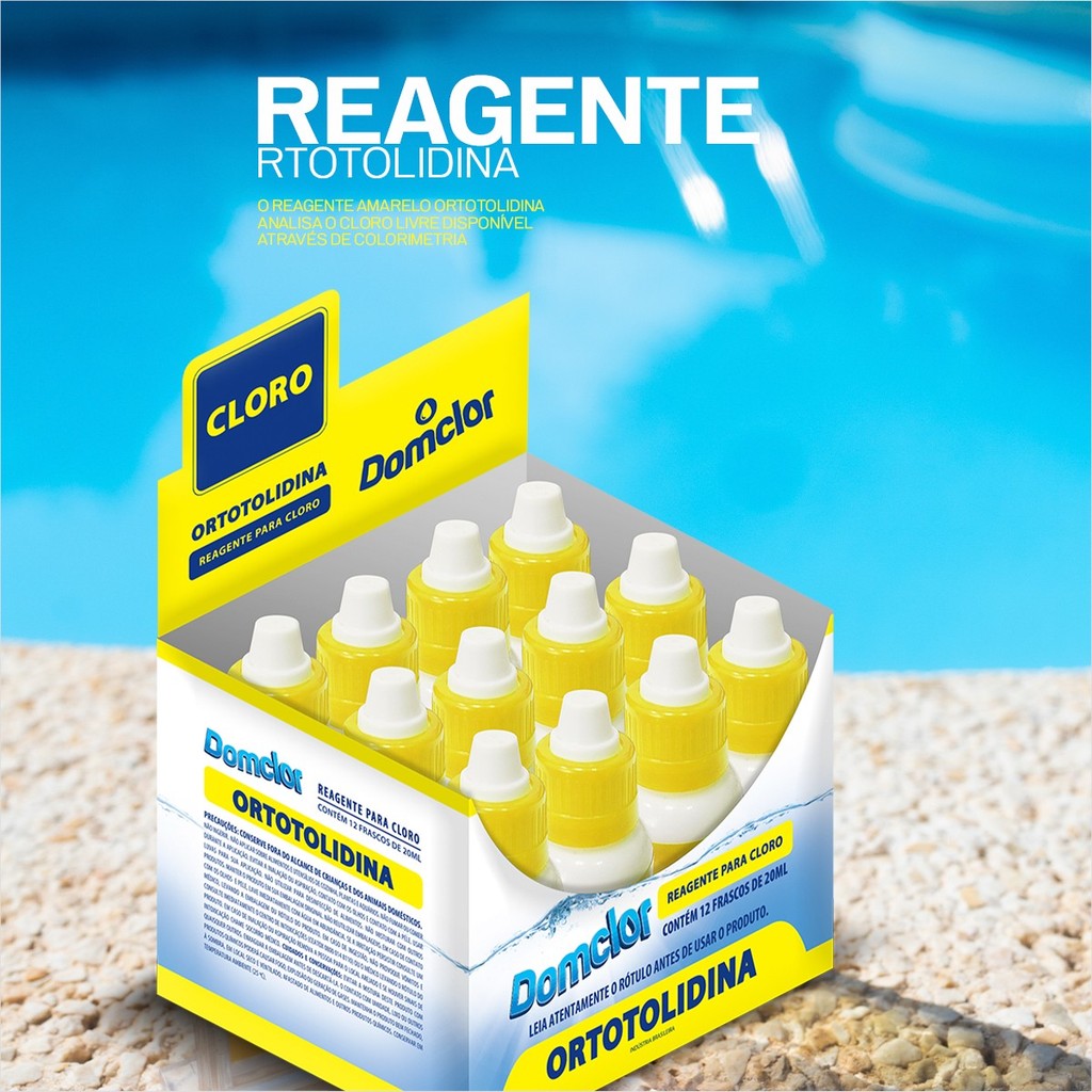 Reagente Ortotolidina Apresentação O reagente amarelo ortotolidina analisa o cloro livre disponível através de colorimetria, os resultados coletados são examinados através de seu estojo ou laboratório DomClor. Reagente Vermelho Fenol apresentação O reagente vermelho fenol analisa o pH através de colorimetria, os resultados coletados são examinados através de seu estojo ou laboratório DomClor. DOMCLOR