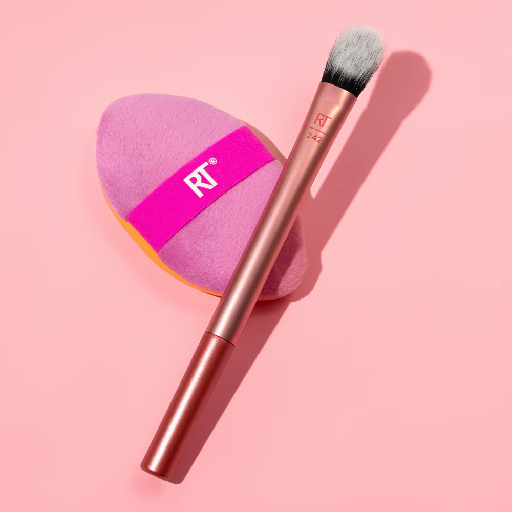 O Real Techniques Precision Perfection Duo apresenta 2 de nossas ferramentas de maquiagem virais para corrigir, misturar e fixar, para que você possa aprimorar sua técnica de mistura. O conjunto de pincel e esponja de maquiagem inclui nosso pincel de corretivo 242 Kitten Paw e Miracle 2-In-1 Powder Puff. O pincel de corretivo viral apresenta um formato exclusivo de pata de gatinho que fornece alta cobertura para esconder perfeitamente sob os olhos para um acabamento levantado. Pode ser usado com seu corretivo líquido ou cremoso favorito. Nossa esponja de pó de dois lados apresenta fibras rosa felpudas que pegam e aplicam pó para fixar sua base, enquanto o lado laranja apresenta nosso material Miracle Complexion Sponge mais vendido para misturar sem esforço fórmulas líquidas e cremosas, como base e corretivo. Como sempre, o pincel Kitten Paw é feito com cerdas UltraPlush de alta qualidade para máxima coleta e aplicação. Para fazer suas ferramentas durarem mais, é recomendável limpar seus pincéis uma vez por semana usando o Real Techniques Brush + Sponge Cleansing Gel. Assim como todos os nossos produtos RT, este pincel e esponja de maquiagem também são 100% livres de crueldade, veganos e projetados com a revolucionária tecnologia de espuma sem látex.