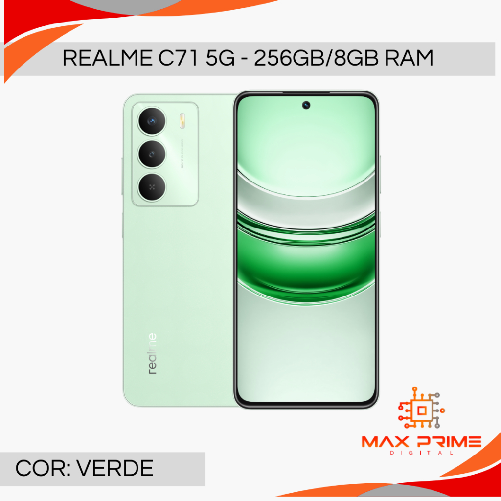 Ficha Técnica – Realme C71 5G Plataforma Chipset: MediaTek Dimensity 6300 5G Processo de Fabricação: TSMC 6 nm Pontuação AnTuTu: 430K+ Memória e Armazenamento RAM: Até 8 GB + 10 GB de RAM dinâmica Armazenamento Interno: Até 256 GB Expansão: Suporte para cartão microSD de até 2 TB Tela Tamanho: 6,67 polegadas Resolução: HD+ com furo perfurado (punch-hole) Taxa de Atualização: 120 Hz Bateria e Carregamento Capacidade: 5000 mAh Carregamento Rápido: 15 W Sistema Interface: realme UI 6.0 Recursos de IA: Google Gemini, Inteligência Facial com IA, Inteligência Artificial Inteligente Funções Extras: Chamada Gratuita, Modo Ultra Volume 300% Construção e Resistência Certificação: Resistência a choques de nível militar Proteção: IP64 – resistência à poeira e respingos d’água Qualidade: Padrão de durabilidade realme Destaque O Realme C71 5G combina conectividade de última geração, alta taxa de atualização de 120 Hz – a mais rápida do segmento – e uma tela punch-hole avançada, garantindo uma experiência visual fluida e imersiva.