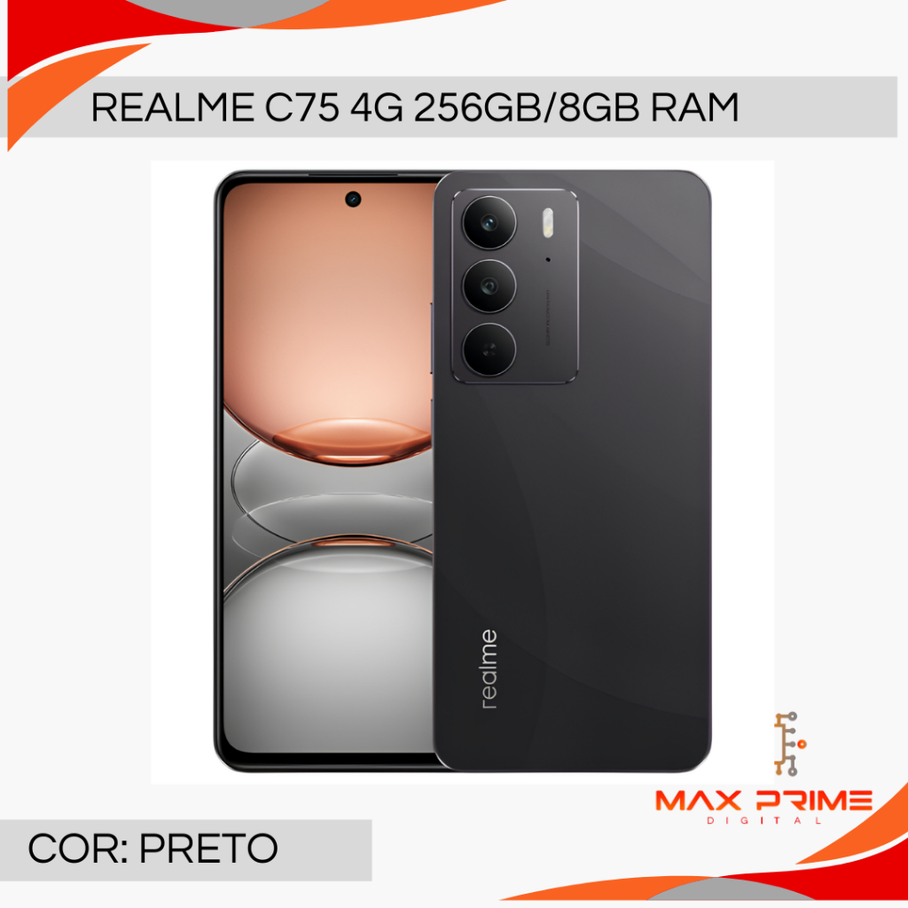 Conheça a Max Prime! Trabalhamos com produtos 100% originais, lacrados e na versão global, oferecendo as melhores marcas e modelos com preços competitivos. Nosso compromisso é trazer a você smartphones de alta qualidade, com segurança e garantia. Com uma equipe dedicada e pronta para atender suas dúvidas, garantimos uma experiência de compra fácil, rápida e confiável. Atenção! Por se tratarem de produtos na versão global, projetados para funcionar em qualquer parte do mundo, os carregadores podem vir com um dos quatro tipos de conexões disponíveis, de forma aleatória. Não é possível escolher o tipo de conexão, pois os produtos são lacrados e não temos como verificar o conteúdo antes do envio. Oferecemos uma garantia de até 1 ano para defeitos funcionais de fábrica (exceto telas e acessórios como carregadores), conforme a política do fabricante. REALME C75 Processador Chipset MediaTek Helio G92 Max Tela Tela FHD de 90 Hz Tamanho da tela: 6,72 polegadas (17,07 cm) Brilho: 580 nits (típico) / 690 nits (HBM) Taxa de atualização: até 90 Hz Vidro ArmorShell™ Proteção ArmorShell™ Carregamento e bateria Carregamento rápido de 45 W Bateria Massiva de 6000mAh Porta USB Tipo C *A bateria do realme C75 tem um valor típico de 6000mAh e é classificada em 5860mAh. Câmera Câmera AI de 50 MP Funções de fotografia: FOTO, RETRATO, VÍDEO, RUA, NOITE, PRO, PANO, ALTA RESOLUÇÃO, FILME, CÂMERA LENTA, LAPSO DE TEMPO, SCANNER DE TEXTO, TILT-SHIFT, LENTE DO GOOGLE Gravação de vídeo: A câmera traseira suporta: 720P@30fps, 1080P@30fps O zoom de vídeo suporta: 720P@30fps, 1080P@30fps Suporte para câmera lenta de vídeo: 720P@120fps Suporte para fotografia com lapso de tempo: 1080P@30fps Câmera Selfie de 8MP Funções de fotografia: Toque para capturar, Mostrar palma, Toque no botão virtual da tela para capturar, Pressione o botão de volume para capturar Gravação de vídeo: Câmera frontal suportada: 720P@30fps (padrão, modo de beleza), 1080P@30fps Botões e Portas 2 slots para cartão Nano SIM + 1 slot para Micro SD Porta Tipo C 1 Microfone Botão liga/desliga Botão de volume Sensores Sensor magnético, sensor de luz, sensor de proximidade, giroscópio, sensor de aceleração Experiência Inteligente de IA Mini Capsule 3.0/AI Clear Face/AI Smart Loop Sistema operacional realme UI 5.0 Android 14 NFC: SIM IP69 Resistência à poeira e água