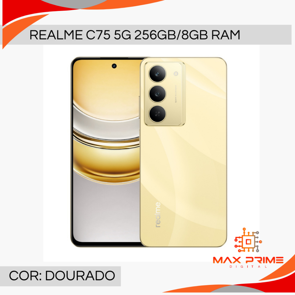 O Realme C75 5G se destaca pela tela de 6,67” com 120Hz e pela bateria gigante de 5828mAh, garantindo horas de uso sem preocupação. Além disso, o carregamento rápido de 45W traz mais praticidade para o seu dia. Com suporte a Dual 5G, NFC, Bluetooth 5.3 e Android 15, o Realme C75 5G é um smartphone completo para quem quer estar sempre conectado. Performance fluida, sistema atualizado e recursos modernos em um único aparelho. ESPECIFICAÇÕES TÉCNICAS Câmera Traseira Principal 50 MP (Omnivision OV50D) Abertura f/1.8, lente 5P Gravação de vídeo até 1080p a 30 fps Câmera lenta 720p a 120 fps Câmera Frontal 8MP Gravação de vídeo até 1080p a 30 fps Processador MediaTek Dimensity 6300 (6 nm), Octa-core, até 2.4 GHz GPU Mali-G57 MC2 @1.07 GHz Memória e Armazenamento RAM 12 GB Armazenamento interno 256 GB Tela 6,67 polegadas (16,94 cm) Resolução HD+ 1604 × 720 Taxa de atualização até 120 Hz Taxa de amostragem de toque até 180 Hz Brilho máximo de 625 nits Proporção tela-corpo de 89,97% 16,7 milhões de cores Contraste 1500:1 Bateria e Carregamento Bateria de 5828 mAh (típica) Capacidade mínima 5660 mAh Carregamento SUPERVOOC de 45 W Porta USB Tipo-C Carregador de 45 W incluso na caixa OBS: O formato do pino conector pode variar de acordo com o lote, não podendo realizar a troca do mesmo Sistema Operacional realme UI 6.0 baseado no Android 15 Rede e Conectividade Dual 5G (SA/NSA) Compatível com 5G / 4G / 3G / 2G Wi-Fi 2.4 GHz e 5 GHz (802.11 a/b/g/n/ac) Bluetooth 5.3 NFC suportado GPS, GLONASS, Galileo, Beidou, QZSS Áudio Alto-falante Super Linear OReality Audio Microfone duplo com cancelamento de ruído Certificação Hi-Res Audio Sensores Impressão digital lateral Sensor de proximidade Sensor de luz Acelerômetro Sensor geomagnético Dimensões e Peso 165,7 × 76,22 × 7,94 mm Peso aproximado de 197 g Proteção contra respingos de água IP69 OBS: Danos causados por submersão a água ou líquidos não são cobertos pela garantia da marca Conteúdo da Embalagem Realme C75 5G Cabo USB Tipo-C Carregador de 45 W Capa protetora Película de tela Agulha do SIM Manual e cartão de garantia