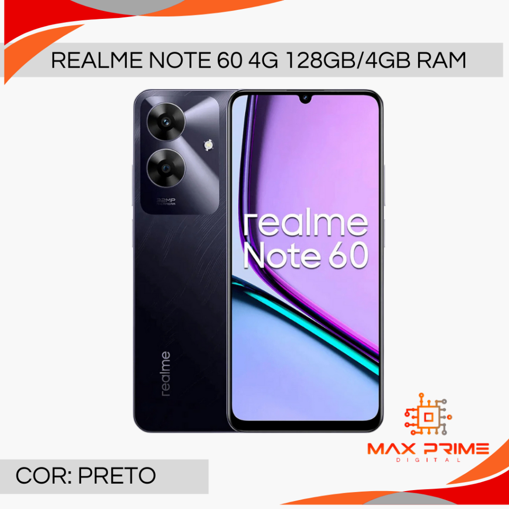 Conheça a Max Prime! Trabalhamos com produtos 100% originais, lacrados e na versão global, oferecendo as melhores marcas e modelos com preços competitivos. Nosso compromisso é trazer a você smartphones de alta qualidade, com segurança e garantia. Com uma equipe dedicada e pronta para atender suas dúvidas, garantimos uma experiência de compra fácil, rápida e confiável. Atenção! Por se tratarem de produtos na versão global, projetados para funcionar em qualquer parte do mundo, os carregadores podem vir com um dos quatro tipos de conexões disponíveis, de forma aleatória. Não é possível escolher o tipo de conexão, pois os produtos são lacrados e não temos como verificar o conteúdo antes do envio. Oferecemos uma garantia de até 1 ano para defeitos funcionais de fábrica (exceto telas e acessórios como carregadores), conforme a política do fabricante. Realme Note 60 4G Câmera super nítida de 32 MP Abertura: f/1.8 Gravação de vídeo 1080P Frontal: 5MP Tela de conforto ocular de 90 Hz Tamanho da tela: 17,1 cm (6,74 polegadas) Resolução: 1600*720 (HD+) Brilho: 450 nits (típico) / 560 nits (HBM) Taxa de atualização: até 90 Hz Chipset UNISOC T612 CPU: octa-core, 2*A75 @1,8 GHz, 6*A55 @1,8 GHz GPU: Mali G57 Bateria enorme de 5000mAh Bateria de longa duração Porta USB Tipo C Carregamento rápido de 10 W Suporta dual 4G standby Botões e Portas Conector de fone de ouvido de 3,5 mm 2 slots para cartão Nano SIM + 1 slot para Micro SD Porta Tipo C 1 microfone Botão liga/desliga Botões de volume Sensores Sensor de indução magnética Sensor de luz Sensor de cintilação Sensor de proximidade Sensor de aceleração Sistema realme UI Baseado no Android 14 Lista de embalagem Protetor de tela realme Note 60 Fonte de energia Cabo USB tipo C Informações importantes sobre o produto (incluindo o cartão de garantia) Guia rápido Bandeja do cartão SIM Pino Capa do telefone