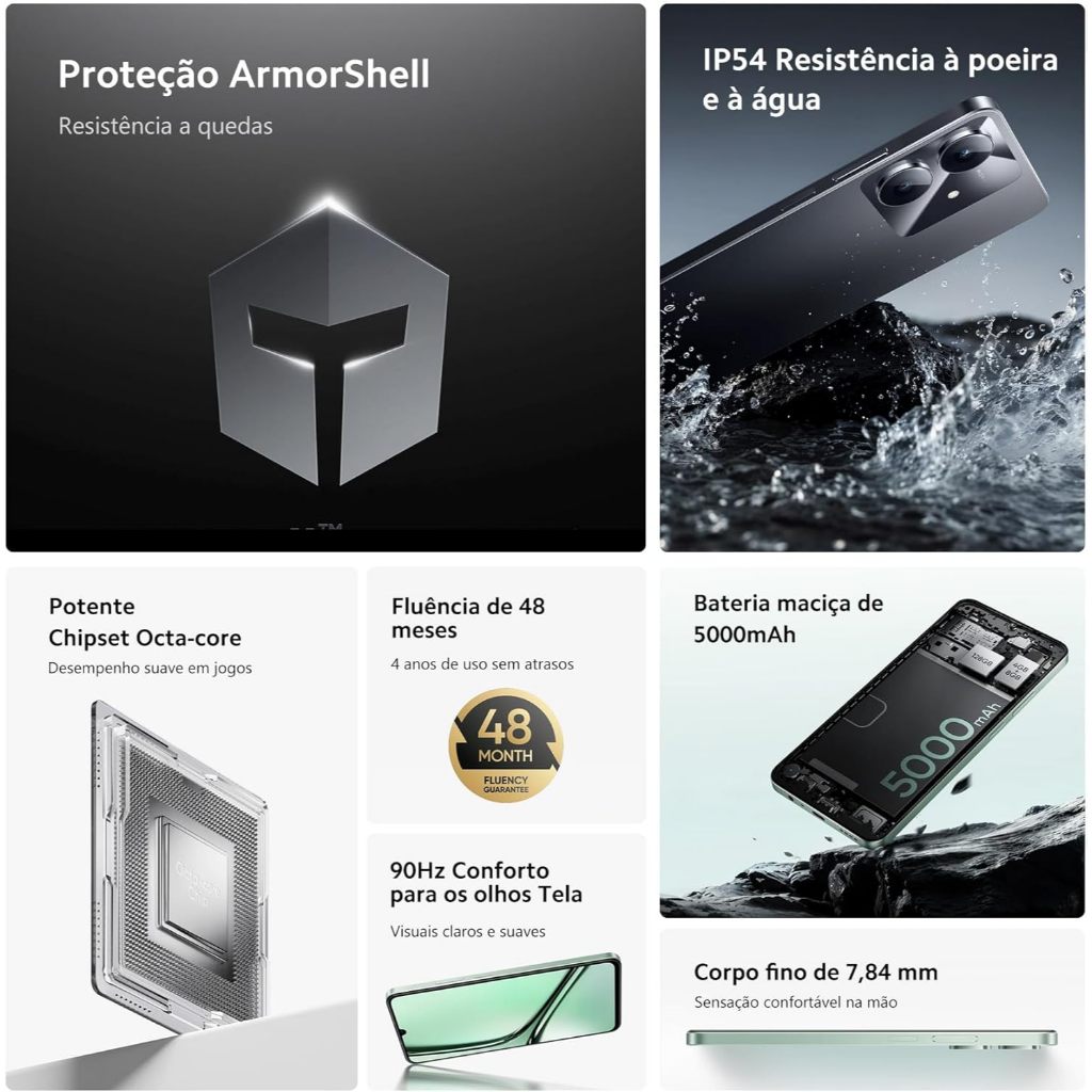 "Realme Note 60x: Tecnologia Inovadora ao Seu Alcance!" O Realme Note 60x é um smartphone Android projetado para oferecer uma experiência prática e funcional. Ele possui uma tela IPS LCD de 6,74 polegadas com taxa de atualização de 90Hz, proporcionando visuais suaves e confortáveis. Com 128GB ou 64GB de armazenamento interno e 4GB ou 3GB de RAM, é ideal para tarefas do dia a dia e armazenamento de arquivos essenciais O Realme Note 60x também conta com conectividade 4G, Wi-Fi, Bluetooth e GPS, além de suporte para Dual SIM. É uma opção acessível para quem busca um smartphone funcional e com boa relação custo-benefício. ESPECIFICAÇÕES: COR - Verde ou Preto (escolher a cor desejada) MEMÓRIA INTERNA 64GB [escolha o modelo desejado] MEMÓRIA RAM 3GB RAM [escolha o modelo desejado] PROCESSADOR - Octa Core, (2x1.8 GHz Cortex-A75 & 6x1.8 GHz Cortex-A55) SISTEMA OPERACIONAL - Android 14 com interface Realme UI TELA - IPS LCD de 6,74 polegadas com resolução HD+ (720x1600 pixels) e taxa de atualização de 90Hz. CÂMERA - Principal 8MP (MegaPix) - Câmera Frontal de 5MP f/2.2 - adequadas para fotos e vídeos básicos. SIM CARD - Dual SIM (Nano) - ( segundo cartão SIM e/ou cartão de memória Micro SD não podem ser usados simultaneamente) BATERIA - 5.000 mAh MEMÓRIA EXTERNA - Suporta cartão Micro SD (até 256GB) CONECTIVIDADE WIRELESS - Suporte a Wi-Fi dual-band, Bluetooth 5.0 e GPS CONTEÚDO DA EMBALAGEM: - O smartphone Realme Note 60x - Um carregador com cabo USB Type-C - Capa protetora para o aparelho - Ferramenta para ejetar o SIM card - Guia rápido e informações importantes
