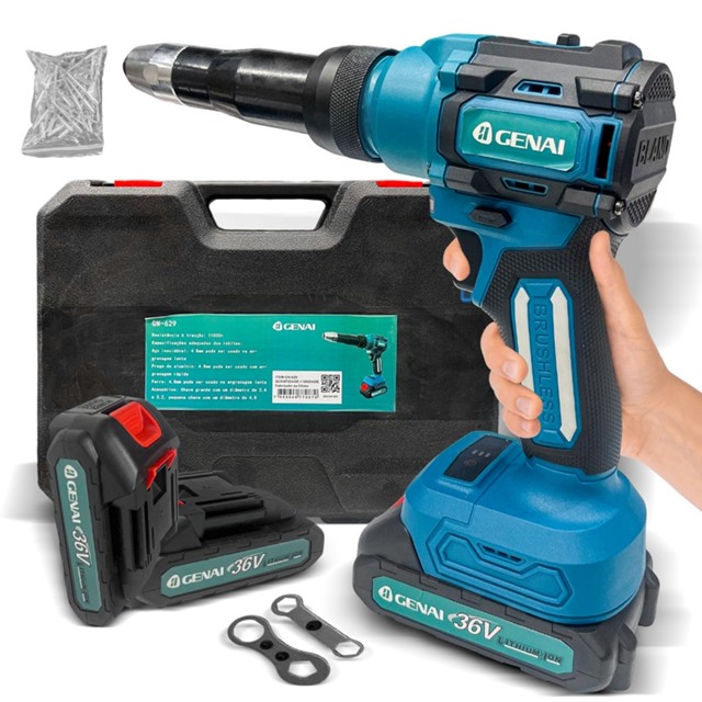 **Rebitadeira a Bateria 36V – Potência, Praticidade e Alta Performance** Ideal para profissionais que exigem **mobilidade, eficiência e robustez**, esta rebitadeira elétrica sem fio oferece **liberdade total de movimento** sem comprometer o desempenho. Perfeita para **linhas de produção, manutenção industrial, montagens e reparos**, sua construção **compacta e leve** permite acesso a espaços confinados, enquanto seu motor potente garante **rebitagem rápida e precisa em diversos materiais**, como metais, alumínio e chaparias. --- ### **Destaques do Produto:** ✅ **Portátil e Sem Fio** – Funcionamento por bateria, eliminando emaranhados de cabos e permitindo trabalho contínuo em qualquer ambiente. ✅ **Alta Capacidade de Rebitagem** – Compatível com rebites de **2,4 mm a 6,0 mm**, atendendo a diversas aplicações profissionais. ✅ **Design Ergonômico** – Leve e balanceada, reduz a fadiga muscular durante o uso prolongado. ✅ **Performance Profissional** – Motor de alta potência para rebitagem **rápida, limpa e sem deformações**. ✅ **Conjunto Completo** – Inclui acessórios essenciais para trabalho imediato e armazenamento seguro. --- ### **Especificações Técnicas:** - **Tensão:** 36V (bateria de íon-lítio) - **Faixa de Rebitagem:** 2,4 mm – 6,0 mm - **Peso:** Leve e compacta (ideal para uso contínuo) - **Tempo de Carga Rápida** – Baterias recarregáveis inclusas garantem produtividade ininterrupta. - **Resistência e Durabilidade** – Corpo reforçado para suportar ambientes industriais. --- ### **Conteúdo da Embalagem:** - 1 Rebitadeira Elétrica sem Fio - 2 Baterias Recarregáveis 36V - 1 Carregador Rápido - **100 Rebites** (assortimento para diversas aplicações) - 1 Maleta Resistente para Armazenamento e Transporte --- **Aplicações Recomendadas:** ✔ Montagem de estruturas metálicas ✔ Manutenção automotiva e naval ✔ Instalações industriais e linha de produção ✔ Projetos de serralheria e soldagem **Garanta Agora Mesmo Sua Rebitadeira Profissional e Tenha Mais Agilidade no Seu Trabalho!** 🚀