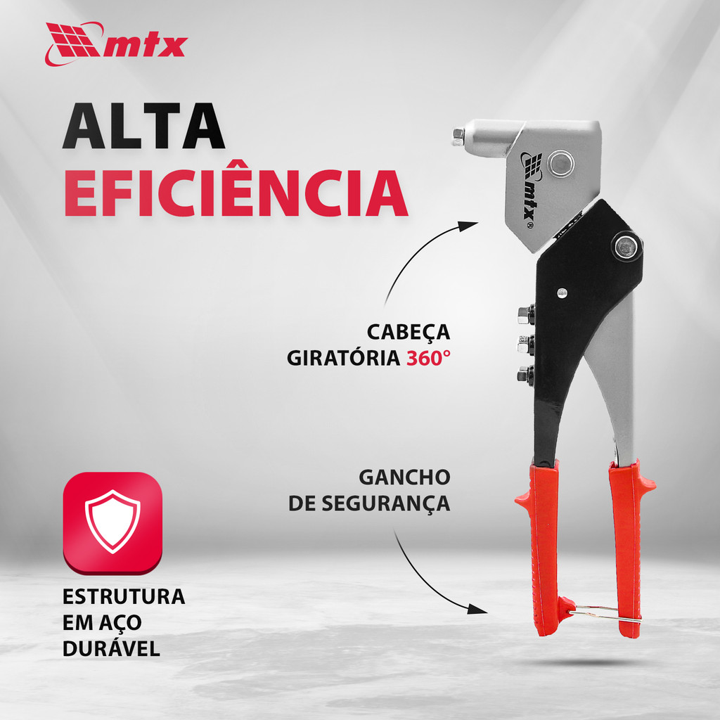 O Rebitador Manual MTX 405339, com seu design inovador e funcionalidade avançada, redefine os padrões de ferramentas manuais para fixação. Com 263 mm de comprimento e uma cabeça giratória única que se ajusta de 0 a 360 graus, esta ferramenta é perfeitamente adequada para fixar peças planas e chapas utilizando rebites com diâmetros de 2,4 mm, 3,2 mm, 4,0 mm e 4,8 mm. Sua capacidade de rotação completa é especialmente valiosa para trabalhar em espaços confinados ou limitados, permitindo uma abordagem versátil e eficaz em uma variedade de situações de trabalho. Características e Vantagens: Alta Durabilidade: Construído com aço estrutural resistente, tanto o corpo quanto a alavanca do Rebitador Manual MTX 405339 são projetados para resistir ao desgaste e ao uso intensivo, garantindo uma ferramenta de longa duração que você pode contar para os mais exigentes projetos de produção, construção e reparos. Instalação Rápida de Bicos: Este rebitador inclui cabeças substituíveis para acomodar rebites de diferentes diâmetros, todas armazenadas de maneira conveniente no corpo da ferramenta para fácil acesso. A chave de montagem, inclusa no conjunto, facilita a troca rápida dessas cabeças, melhorando significativamente a eficiência do trabalho e reduzindo o tempo de inatividade. Trabalho Confortável sem Fadiga: As alças do rebitador são cuidadosamente projetadas com uma superfície em relevo e apoios para os dedos, proporcionando um encaixe confortável e seguro nas mãos. Esta ergonomia bem pensada minimiza a fadiga durante o uso prolongado, tornando o trabalho mais agradável e menos cansativo. Armazenamento Conveniente: Um grampo de fixação inteligentemente integrado mantém as alças firmemente juntas quando a ferramenta não está em uso, facilitando o armazenamento seguro e mantendo a organização da sua área de trabalho. O Rebitador Manual MTX 405339 é uma escolha excepcional para profissionais e entusiastas do DIY que exigem o máximo em versatilidade, durabilidade e conforto. Seja em ambientes de produção, em canteiros de obras, ou para reparos domésticos, esta ferramenta oferece uma solução robusta e confiável para todas as suas necessidades de fixação, mesmo nos espaços mais desafiadores.