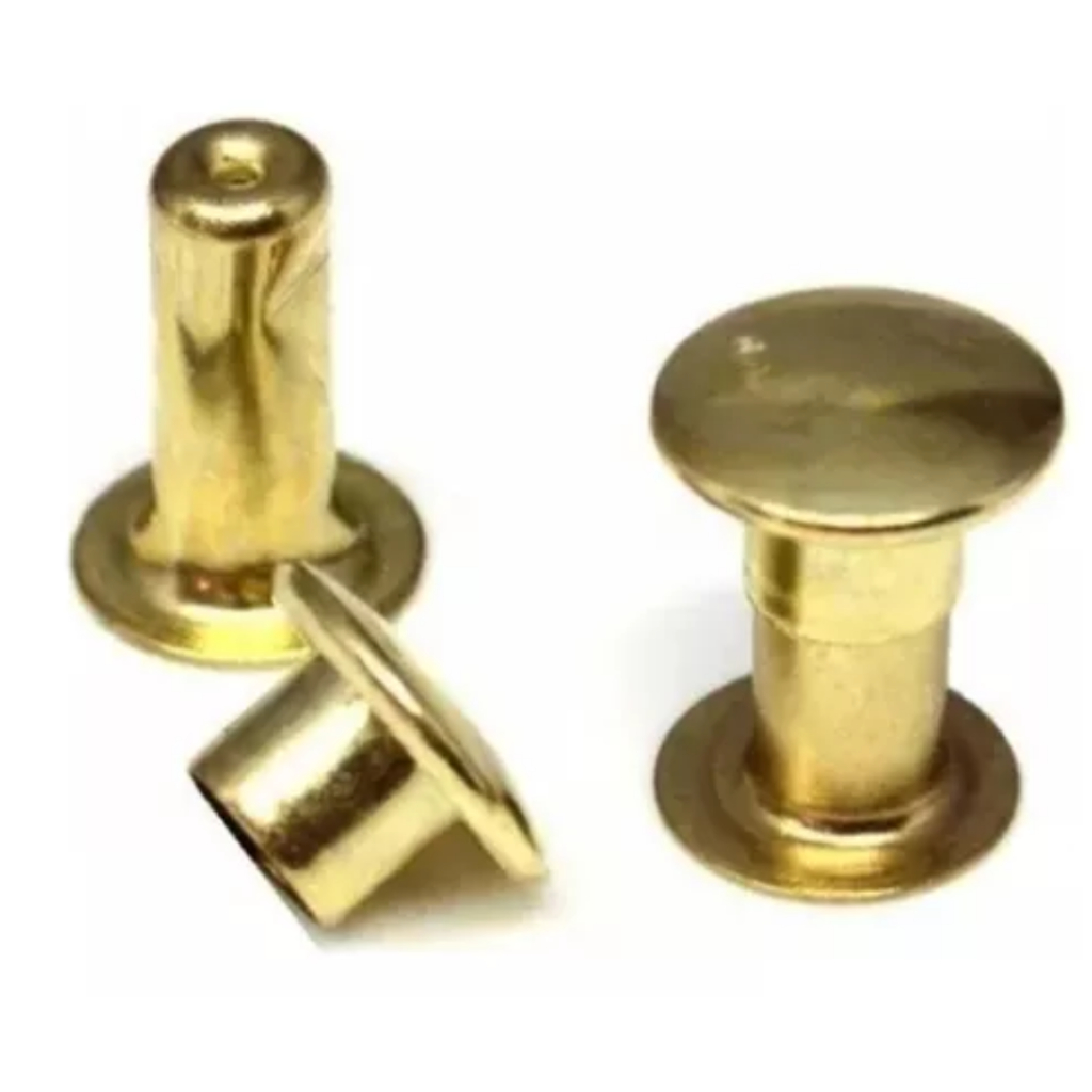 - kit 100 pares de rebites n 1 1/2 de ferro - Dimensões : - ALTURA 6 mm - LARGURA 7 mm ideal pra confecções de produtos pet guias bolsas mochilas cintos e etc... material de ferro niquelado,produto não nocivo a saúde.