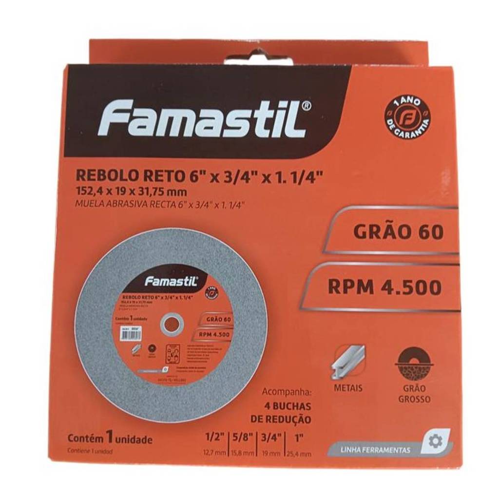 Rebolo Abrasivo Famastil 6 Polegadas Grão 60 — Para Afiação e Desbaste de Metais Alta Precisão e Durabilidade