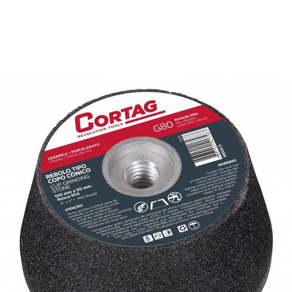 Produto: Rebolo cônico para esmerilhadeira angular 100mm rosca M18 G80 Marca: Cortag Descrição: O Rebolo cônico rosca M18 G80 da Cortag é indicado para esmerilhadeiras angulares para desbaste e acabamentos em pisos, revestimentos, mármores, granito, cerâmicas e porcelanatos. Esse rebolo possui a rosca M14 para facilitar o encaixe na maioria das esmerilhadeiras e tem o diâmetro de 100mm. Características: - Rosca M18: Garante a compatibilidade com diversas esmerilhadeiras angulares. - Grão G80: Proporciona um bom equilíbrio entre agressão e acabamento, sendo ideal para a maioria das aplicações. - Forma cônica: Permite alcançar áreas de difícil acesso e realizar trabalhos em diferentes ângulos. Especificações: Grão: 80 Rotação máxima: 9000 RPM Materiais para utilização: pisos, revestimentos, mármores, granito, cerâmicas e porcelanatos. Peso: 0.52 Kg