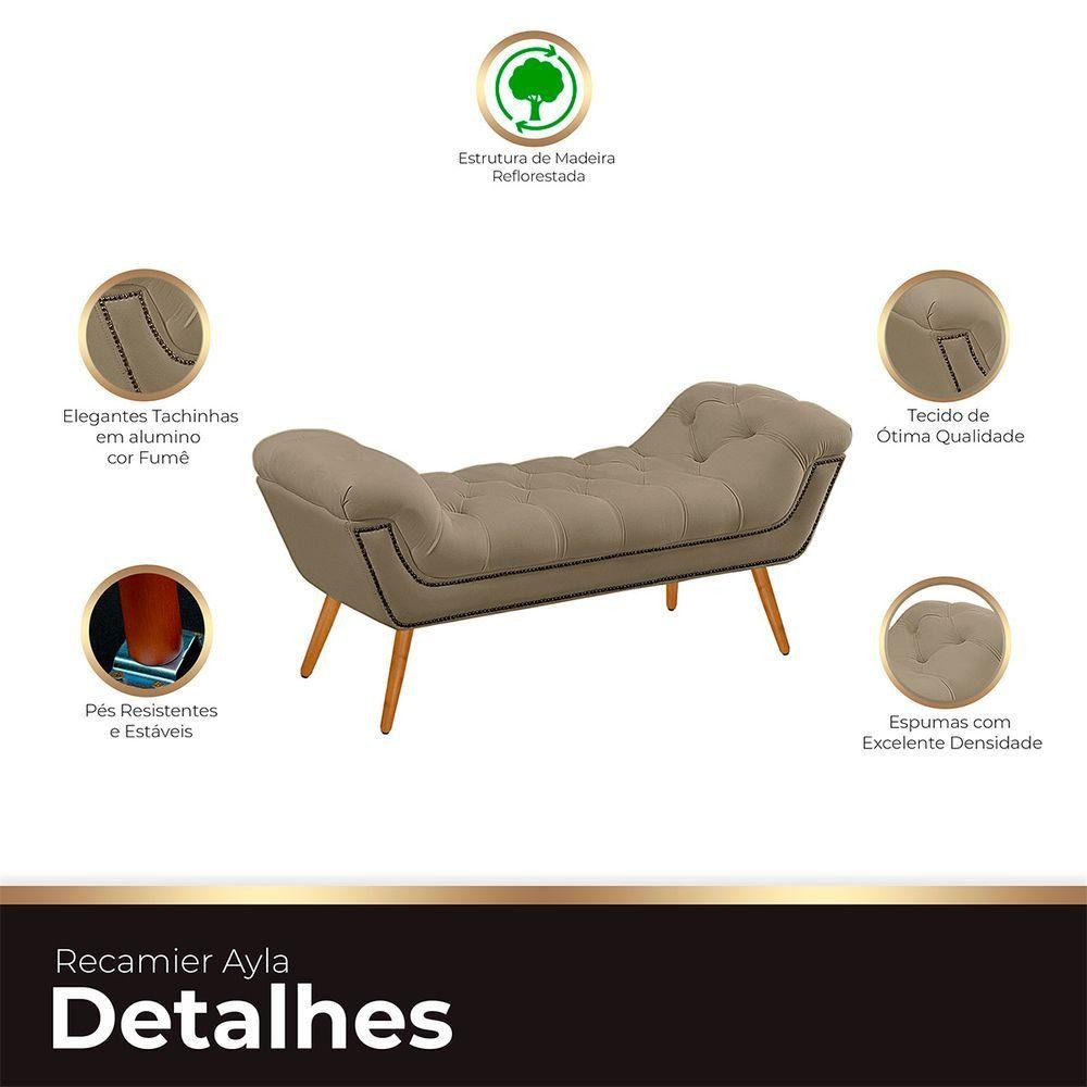 Recamier Estofada Casal King Size Ayla Veludo Cor Bege Médio Introduza um toque de elegância ao seu quarto com o Recamier Estofado Ayla. Este móvel é mais do que estiloso e moderno; é a expressão máxima de sofisticação. Com detalhes em captones no assento e nas braças, além de acabamentos com botões na cor do móvel, esta recamier oferece uma decoração inigualável. As tachinhas de alumínio adicionam um charme extra, elevando ainda mais o ambiente. Além de funcional, o Recamier Ayla é uma verdadeira obra de arte, trazendo não apenas conforto, mas um toque de elegância incomparável ao seu espaço pessoal. Renove seu quarto com esta peça única. ESPECIFICAÇÕES Material da estrutura: Madeira de reflorestamento; Revestimento: Tecido Veludo; Espuma: De alta densidade; DIMENSÕES DA RECAMIER Altura total: 0,60cm; Largura total: 2,00cm; Profundidade total: 0,53cm; Peso: 22kg. A GARANTIA É DE FÁBRICA Na Ateliê do Conforto, estamos comprometidos em proporcionar a você não apenas produtos de qualidade e sofisticação incomparáveis, mas também uma garantia que reflete nossa confiança no que fazemos. Ao escolher comprar conosco, você recebe não apenas um produto excepcional, mas também a tranquilidade de saber que estamos ao seu lado. Se, por qualquer motivo, seu produto apresentar algum problema nos próximos noventa dias, como fabricantes, estamos aqui para oferecer total assistência. Nossa prioridade é garantir que sua experiência de compra seja não apenas satisfatória, mas excepcional. Queremos que você tenha a certeza de estar negociando com uma empresa que valoriza, acima de tudo, a confiança mútua com seus clientes. Sua satisfação é a nossa maior recompensa. QUEM SOMOS? Na Ateliê do Conforto, somos especializados em criar cabeceiras, calçadeiras e recamiers de excelência. Localizados em Arapongas, epicentro do setor moveleiro no Sul do país, nossa equipe altamente experiente garante qualidade superior. Escolha nossos produtos para aprimorar seu quarto com beleza e conforto inigualáveis CUIDADOS COM A LIMPEZA Utilizar um pano limpo e seco. Não limpar com produtos abrasivos ou escovas. Não deixar exposta à luz do sol diretamente pois isso irá diminuir a vida útil do produto, fazendo-o envelhecer precocemente. Este produto não é recomendado para ambientes externos onde possa receber chuva. MONTAGEM - A Recamier chegará montada para você, bastando apenas colocar os pés. INFORMAÇÕES IMPORTANTES - Todos os produtos vão embalados com total segurança; - A do produto é realizada em todo território nacional, até onde as rodovias alcançam, s fluviais ou aéreas devem ser cotadas a parte; - Objetos decorativos que aparecem na foto não acompanham o produto; - Pode haver alguma diferença de tonalidade entre a imagem e o produto real, por conta do tratamento de imagens e a calibração de cores do seu monitor; - Por se tratar de estofado as medidas podem ter uma pequena variação em até 3 cm; - Confira as dimensões do produto e certifique-se de que passará normalmente por supostos elevadores, portas, escadas e/ou corredores de sua residência, já que nossa não inclui a subida de lances de escada, ou o lançamento de produtos; - Ao receber a mercadoria, o cliente deve verificar as condições da embalagem, caso haja alguma avaria não assine o comprovante de recebimento; - Observando as orientações acima, evita-se futuros desagrados ou imprevistos com a do produto. Havendo despesas adicionais.