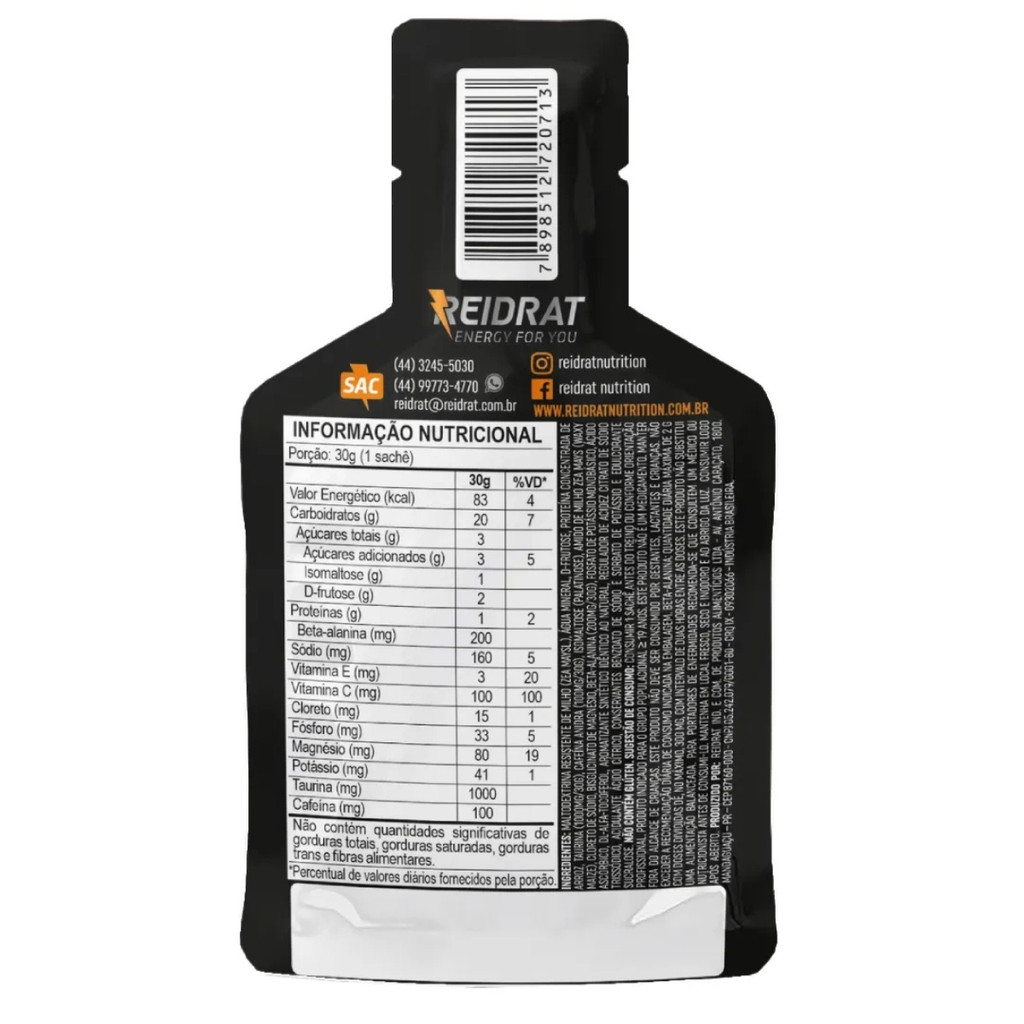 Sobre o produto: O Recarb Energy Gel Black da Reidrat Nutrition é um suplemento energético em gel formulado especialmente para atletas que buscam desempenho máximo em atividades de alta intensidade e longa duração. Sua composição estratégica combina diferentes fontes de carboidratos de rápida absorção (maltodextrina, frutose, palatinose e waxy maize), eletrólitos essenciais (sódio e potássio), aminoácidos e estimulantes que contribuem para aumento da energia, foco e resistência. Com 1000mg de taurina, 100mg de cafeína e 200mg de beta-alanina por sachê, o Recarb Energy Gel Black promove melhora no desempenho físico e mental, reduzindo a sensação de fadiga e favorecendo a hidratação eficiente. Como consumir - Consumir 1 sachê (30g) antes do treino ou conforme orientação de médico ou nutricionista. - Após aberto, consumir imediatamente. Benefícios - Energia rápida e duradoura - 1000mg de taurina por dose - 100mg de cafeína por dose - 200mg de beta-alanina por dose - Melhora do foco, resistência e desempenho físico - Reposição de eletrólitos perdidos com o suor - Com carboidratos de absorção gradual: palatinose e waxy maize - Fonte de aminoácidos essenciais da proteína de arroz - Enriquecido com vitaminas C e E Alergênicos: Não contém glúten. Ingredientes: Maltodextrina resistente de milho (Zea mays), água mineral, D-frutose, proteína concentrada de arroz, taurina (1000mg), cafeína anidra (100mg), isomaltose (palatinose), amido de milho (waxy maize), cloreto de sódio, bisglicinato de magnésio, beta-alanina (200mg), fosfato de potássio monobásico, ácido ascórbico, DL-alfa-tocoferol, aroma sintético idêntico ao natural, regulador de acidez citrato de sódio trissódico, acidulante ácido cítrico, conservantes benzoato de sódio e sorbato de potássio, e edulcorante sucralose. Advertências - Produto indicado para adultos (Maiores de 19 anos) - Não é recomendado para gestantes, lactantes e crianças - Não exceder a dose diária recomendada - Manter fora do alcance de crianças - Beta-alanina: quantidade máxima de 2g por dia, dividida em doses de no máximo 300mg com intervalo mínimo de 2 horas - Este produto não substitui uma alimentação equilibrada - Diabéticos: contém frutose e glicose Conclusão: O Recarb Energy Gel Black da Reidrat Nutrition é ideal para atletas que exigem o máximo do seu corpo. Combinando energia, foco e resistência em um só produto, ele ajuda a elevar a performance em treinos e competições intensas, com praticidade e segurança.