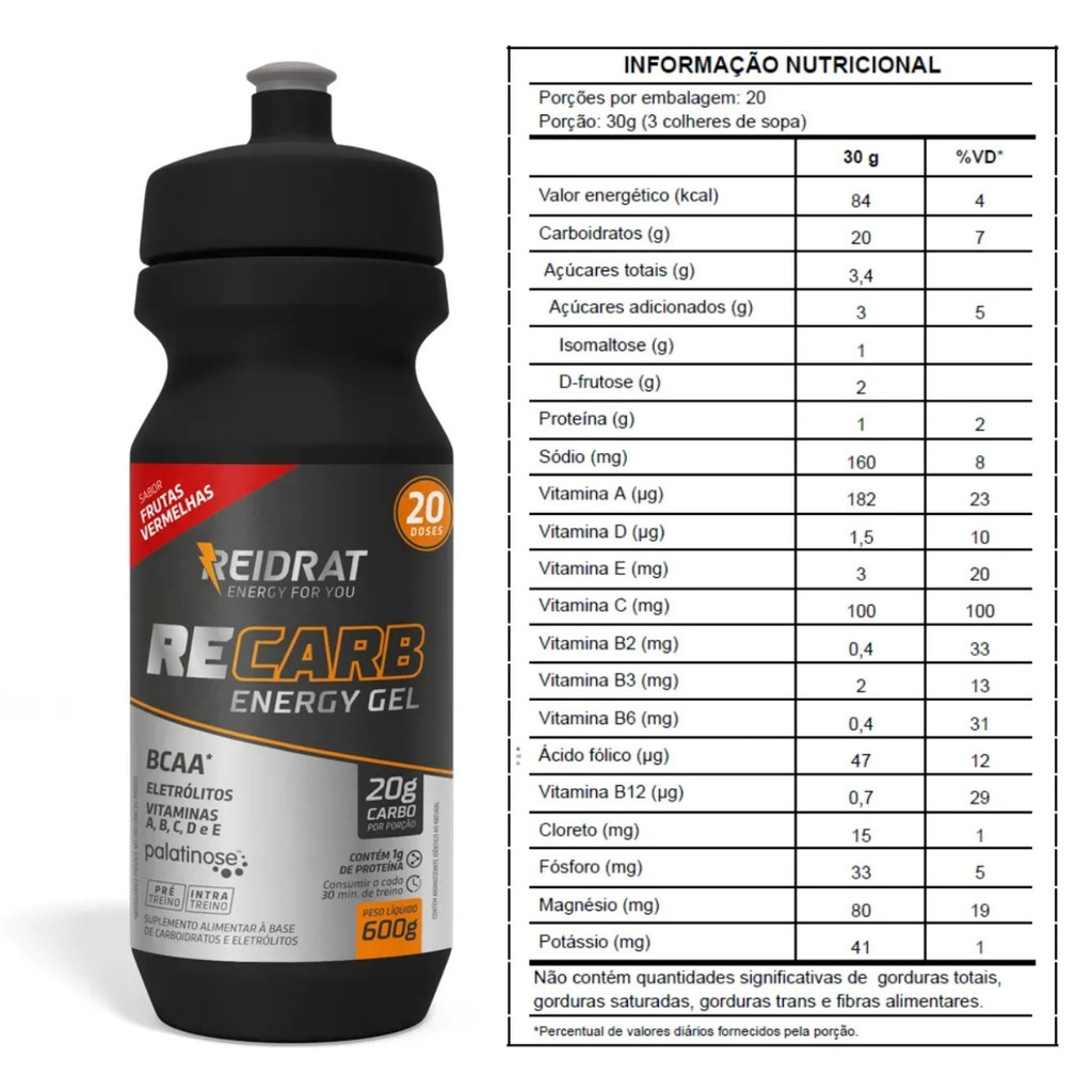 Sobre o produto: O Recarb Energy Gel Squeeze da Reidrat Nutrition é um suplemento energético em gel desenvolvido para fornecer energia imediata e duradoura durante treinos e competições de longa duração. Sua fórmula avançada combina quatro tipos de carboidratos (maltodextrina, frutose, palatinose e waxy maize), proteína concentrada de arroz, eletrólitos e um complexo completo de vitaminas (A, B2, B3, B6, B12, C, D e E), contribuindo para a manutenção do desempenho físico, prevenção da fadiga e redução do risco de desidratação. Cada frasco contém 600g, o equivalente a 20 doses de 30g do Recarb Energy Gel, prontas para uso de forma prática e econômica. Como consumir - Consumir uma dose (30g) cerca de 30 minutos antes do exercício e repetir a cada 30 minutos de atividade contínua, ou conforme recomendação de profissional da saúde. - Após aberto, conservar na geladeira e consumir em até 30 dias. Benefícios - Energia rápida e contínua para atividades prolongada - Reposição eficaz de eletrólitos e vitaminas essenciais - Auxilia na preservação da massa muscular - Contribui para melhor desempenho físico - Embalagem prática e econômica com 20 doses - Solução sustentável: menos resíduos descartáveis Sustentabilidade: - A embalagem Squeeze da Reidrat Nutrition foi pensada para reduzir o impacto ambiental, evitando o descarte de 20 sachês plásticos na natureza. - Após o uso, basta retirar o rótulo e reutilizar a squeeze em outras finalidades. • REduza • REuse • REpense Composição por porção (30g): - Mix de carboidratos: maltodextrina, frutose, palatinose e waxy maize - Proteína concentrada de arroz - Eletrólitos: sódio, potássio e magnésio - Vitaminas: A, B2, B3, B6, B12, C, D e E Alergênicos: Não contém glúten. Ingredientes: Maltodextrina resistente de milho (Zea mays), água mineral, D-frutose, proteína concentrada de arroz, isomaltose (palatinose), amido de milho (waxy maize), bisglicinato de magnésio, cloreto de sódio, fosfato de potássio monobásico, ácido ascórbico, DL-alfa-tocoferol, niacina, riboflavina, piridoxina, acetato de retinol, colecalciferol, cianocobalamina, aroma sintético idêntico ao natural, regulador de acidez citrato de sódio trissódico, acidulante ácido cítrico, conservantes benzoato de sódio e sorbato de potássio. Advertências - Diabéticos: contém frutose e glicose - Este produto não substitui uma alimentação equilibrada - Consulte um médico ou nutricionista antes de consumir - Armazenar ao abrigo da luz solar, em local seco e fresco - Após aberto, consumir em até 30 dias Conclusão: O Recarb Energy Gel Squeeze da Reidrat Nutrition é a opção ideal para atletas e praticantes de atividades físicas que precisam de energia rápida e constante. Sua embalagem reutilizável e prática é um diferencial para quem busca performance com responsabilidade ambiental.