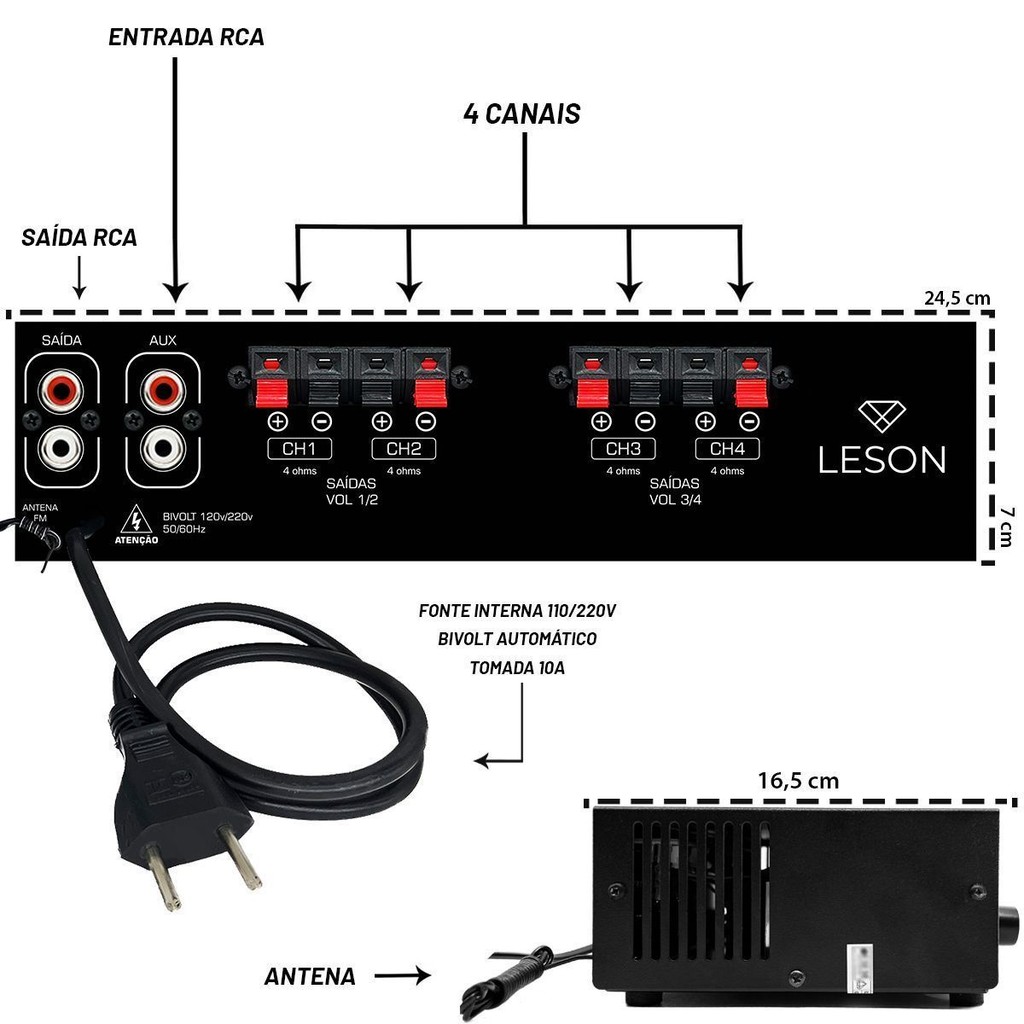 Receiver Leson LSA 7000 PRO – 120W RMS, 4 Ohms, Bivolt Automático Potência, versatilidade e qualidade de som em um único equipamento! O Receiver Leson LSA 7000 PRO é a escolha ideal para sonorizar ambientes comerciais e residenciais com praticidade e excelente desempenho. Compacto e fácil de instalar, oferece múltiplas conexões e controles dedicados para garantir uma experiência sonora completa em diferentes aplicações, como igrejas, escolas, hotéis, bares, lojas, consultórios e até em casa. Principais características: • Potência de 120W RMS (480W PMPO): Áudio potente e de alta fidelidade para qualquer ambiente. • Conexões Versáteis: Entradas USB, SD, RCA, FM e Bluetooth para reproduzir músicas de diferentes fontes. • Praticidade: Controle remoto incluso para ajustar o som à distância com facilidade. • Capacidade de Expansão: 4 saídas de áudio que suportam até 16 alto-falantes (consultar manual para instalação correta). • Entradas P10: 2 entradas dedicadas para microfones ou instrumentos musicais. • Bivolt Automático: Compatível com 110V e 220V, garantindo mais segurança e praticidade na instalação. • Design Compacto: Estrutura leve e moderna, fácil de instalar em diversos locais. Especificações Técnicas: • Potência RMS: 120W • Potência Máxima PMPO: 480W • Impedância mínima: 4 Ohms • Entradas: USB, SD, RCA, Bluetooth • Saídas: 4 canais de áudio borne, 1 saída RCA • Tensão: Bivolt Automático (110V/220V) Dimensões: • Largura: 24,5 cm • Profundidade: 16,5 cm • Altura: 7 cm Conteúdo da Embalagem: • 01 Receiver Leson LSA 7000 PRO • 01 Controle Remoto Com o Leson LSA 7000 PRO, você tem um receiver robusto, moderno e pronto para entregar o melhor do som em qualquer projeto de sonorização.