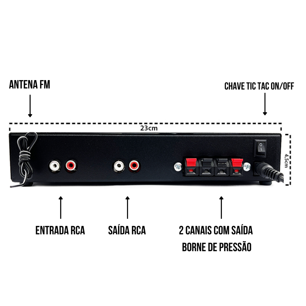 Amplificador Receiver RC1002Bt Slim 40W Som Ambiente Orion Bluetooth Usb Micro SD Auxiliar Rca Fm 2 Canais de 20W 1 Entrada P10 para Microfone Compatível com ALEXA e GOOGLE ASSISTENTE Amplificador para som ambiente Bluetooth Usb Micro SD Auxiliar Rca Fm 2 Canais compacto para uso geral, com alto desempenho e qualidade de reprodução para todas as faixas de frequência de áudio, entrada de microfone, controles de volume, microfone separado, podendo ser usado como setorizador para 2 ambientes. Uma ótima opção para o seu projeto de som ambiente, podendo ser instalado facilmente. Características Técnicas do Amplificador: • Entradas: Auxiliar P2, USB, Micro Sd, Bluetooth, Rca, P10, FM • Sistema Estéreo • 40W RMS • 2 a 8 ohms • Duas Saídas com Borne • Entrada RCA • Saída RCA • Controle de volume independente por canal • Carcaça metálica • Alimentação Bivolt 110v/220v • Controle Remoto • Dimensões: -Altura: 4,5 cm 23 cm -Largura: 23 cm -Profundidade: 10 cm •Peso: 657g