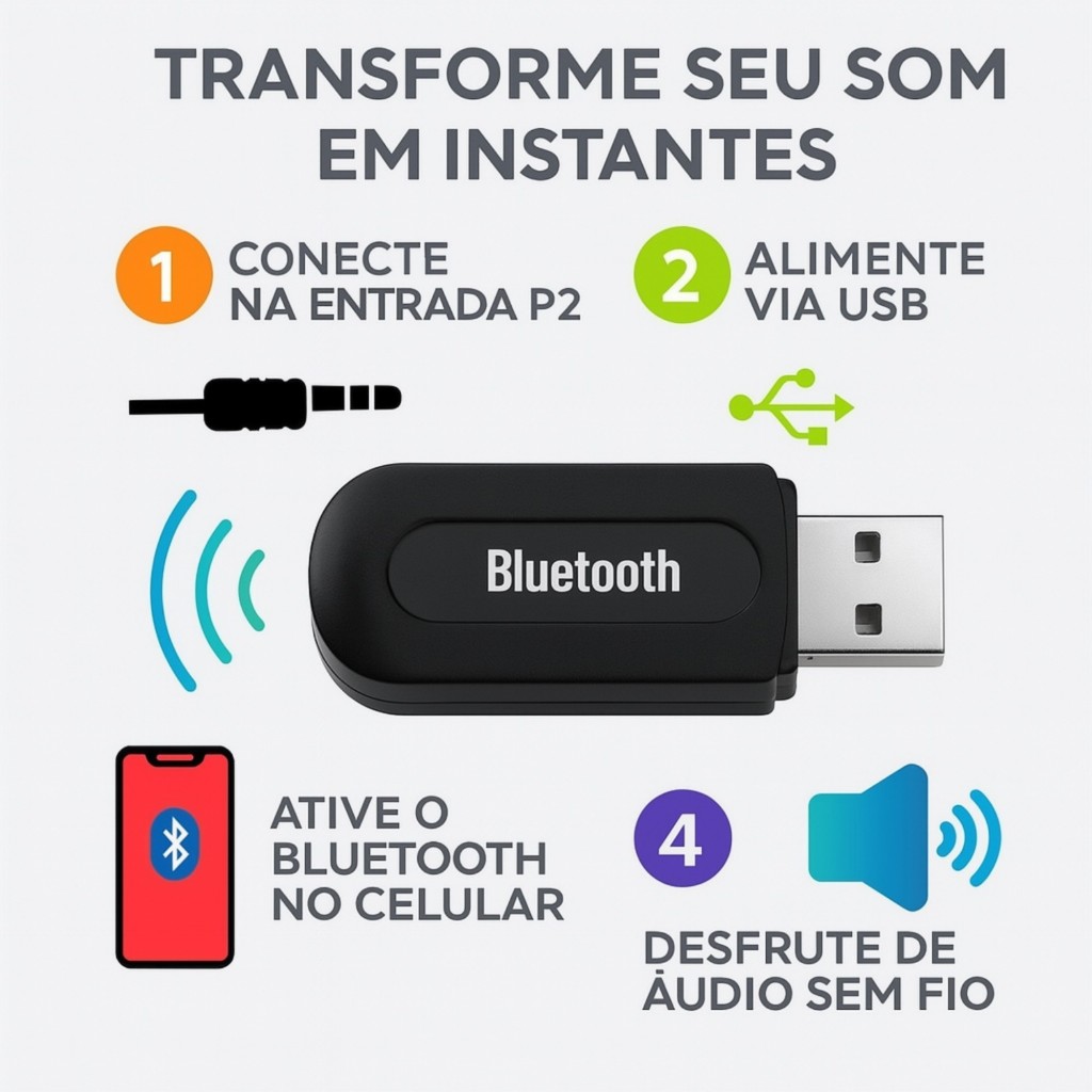 O Receptor de Música Sem Fio Bluetooth P2 USB da TSALEACH ACTIVE é a solução perfeita para transformar qualquer dispositivo de áudio comum em um equipamento moderno com conexão sem fio. Basta conectar na entrada P2 e alimentar via USB, e você terá música de alta qualidade diretamente do seu celular, tablet ou notebook, sem cabos atrapalhando. Compatível com caixas de som, aparelhos de som automotivo, sistemas de home theater, este adaptador é versátil e prático. Seu design compacto e portátil permite levá-lo para qualquer lugar, sendo ideal tanto para uso doméstico quanto em viagens. Com tecnologia avançada, o adaptador proporciona áudio claro, potente e estável, garantindo a melhor experiência sonora. A instalação é extremamente simples: conecte, faça o pareamento Bluetooth e aproveite. Além disso, por ser da marca TSALEACH ACTIVE, você conta com qualidade garantida e suporte confiável. Este adaptador é indicado para quem busca modernizar equipamentos, eliminar fios e ter liberdade total para ouvir músicas, podcasts e chamadas sem perder qualidade de áudio. FAQ O adaptador precisa de bateria? Não, ele é alimentado diretamente via USB, dispensando baterias. Funciona em som automotivo? Sim, basta conectar o P2 na entrada auxiliar e o USB na porta do carro. É compatível com todos os celulares? Sim, é compatível com qualquer dispositivo que possua Bluetooth. O som perde qualidade por ser sem fio? Não, a tecnologia Bluetooth mantém alta fidelidade de áudio. Precisa instalar algum aplicativo? Não, é só conectar, parear e começar a usar.