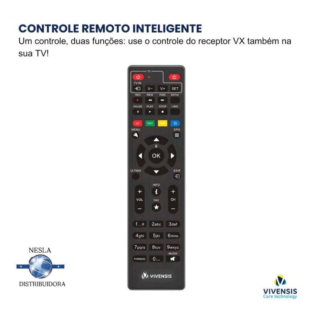 -----Receptor VX10 da Nova Parabólica Digital---- O receptor mais escolhido pelos instaladores com imagem e som em alta definição para a diversão de toda a família! Compatível com todos os tipos de televisores (Tv de Tubo, Telas Planas e Smartv). Vx10 Sat Hd Digital Regional Banda Ku Vivensis é um dispositivo projetado para receber sinais de TV digital via satélite de alta definição (HD) na banda Ku, com capacidade regional. Isso significa que o receptor é capaz de receber canais de TV digital HD de satélites que transmitem na região onde o dispositivo está localizado. Fora isso , o receptor Vx10 Sat Hd Digital Regional Banda Ku Vivensis é fácil de configurar e utilizar, com uma interface intuitiva e amigável. O produto é ideal para quem busca um dispositivo que ofereça uma ampla variedade de canais HD e uma experiência de entretenimento completa. O Receptor VX10 possui resolução de vídeo Full HD, para você curtir um universo de conteúdos sob a melhor perspectiva com qualidade digital. A instalação é super intuitiva. Selecione as configurações desejadas em poucos cliques no controle remoto. Sintonia perfeita Aproveite e grave músicas, vídeos fotos plugando um pen drive. O modelo ainda traz conexões USB, HDMI e RCA mostrando ser compatível com as TVs mais antigas de tubo, e também com as mais modernas do tipo tela plana. Sintonize canais automaticamente via satélite em HD e SD. -Especificações: Marca: Vivensis Modelo: VX10- 199 Qualidade de sinal Digital Entradas RCA, USB e HDMI -Resolução de Vídeo: 1080p, 1080i, 720p, 420p, 480i, 576p, 576i -Processador: 2000DMIPS Dual 32-bit RISC CPU Advanced 2D vector graphic engi Garantia: 2 anos de fábrica. === ACESSÓRIOS VIVENSIS VX10 === * Controle Remoto Inteligente * Pilhas AAA (x2) * Cabo HDMI 1.5 m * Cabo AV 1.2 m * Adaptador 12V – 1,5A * Manual Impresso ✅ PRODUTO ORIGINAL ✅ PRODUTO COM NOTA FISCAL 📬 Envio rápido e seguro! 💬 Qualquer dúvida, estamos à disposição no chat