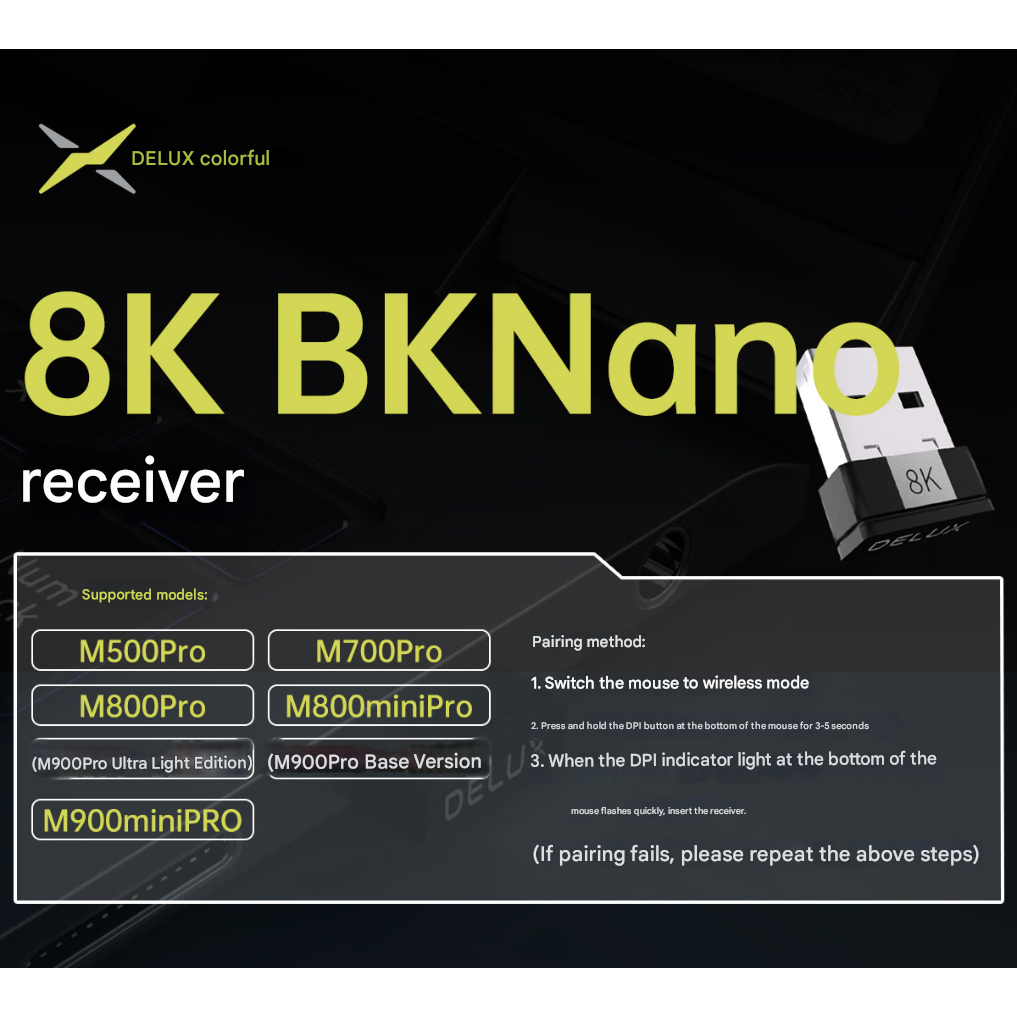 Exclusivamente para: M900Pro / M900mini Pro / M700Pro / M800mini Pro Tipo de conexão sem fio de 2,4 GHz Interface de Interface: USB Taxa de Manutenção de Sustentação de até 8000 Hz (8K/4K/2K/1K) Melhor para: jogos FPS / torneios esportivos / controle de precisão de alta velocidade
