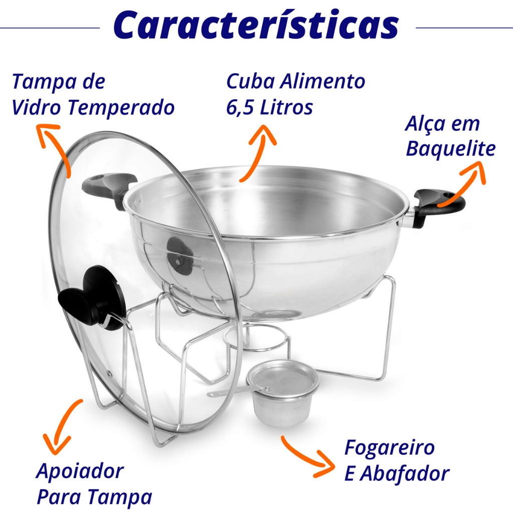 🍽️ Panela Rechaud 6,5L em Alumínio – Ideal para Buffet, Festas e Eventos 🔹 Capacidade: 6,5 Litros 🔹 Material: Alumínio resistente – leve, durável e excelente condutor de calor 🔹 Indicação de Uso: Ideal para manter alimentos aquecidos em festas, buffets, eventos, jantares e uso profissional 🔹 Tampa: De vidro, preserva o calor por mais tempo 🔹 Design: Tradicional e funcional, fácil de montar e limpar ✨ Destaques: ✔ Excelente custo-benefício ✔ Mantém a comida quente por mais tempo ✔ Ideal para servir arroz, massas, carnes e outros pratos quentes ✔ Compatível com réchaud a álcool