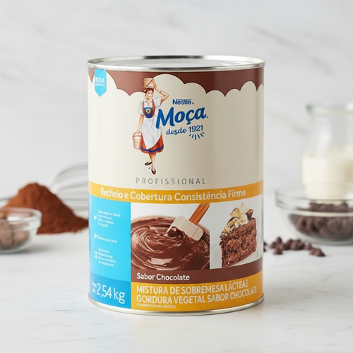 O Recheio de Chocolate Consistência Firme Moça NESTLÉ é um preparo que faz parte da linha de recheios e coberturas de NESTLÉ profissional, feito a partir do clássico Leite Condensado Moça, é pronto para uso e muito prático! O Recheio de Chocolate Consistência Firme Moça NESTLÉ com sua consistência firme, garante maior padronização, ponto, sabor e ainda oferece maior praticidade e agilidade nos processos da receita, economizando tempo e mão de obra, ainda por não conter amido em sua formulação, o produto não cristaliza o tornando-se perfeito para congelar. É indicado para receitas de recheios e coberturas de bolos e tortas! Peso Líquido: 2,54kg. Ingredientes: Leite condensado (leite pradronizado e açúcar), açúcar, água, cacau em pó, gordura vegetal, maltodextrina, sal, espessante pectina e aromatizantes. NÃO CONTÉM GLÚTEN. ALÉRGICOS: Contém leite e derivados de soja. Pode conter amendoim.