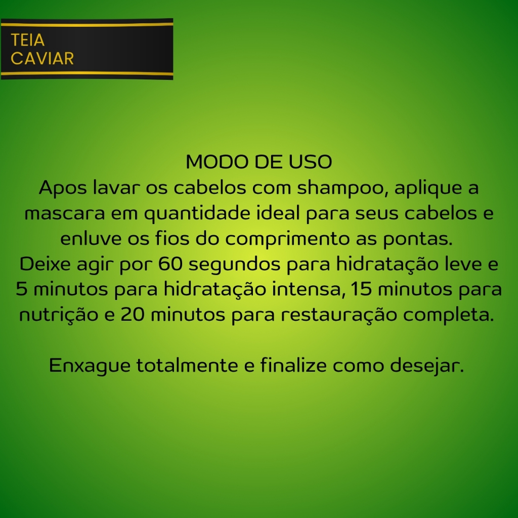 Máscara Reconstrutora Teia Caviar Pantovin 1KG Three Therapy -- Recupere a força, o brilho e a vitalidade dos seus fios em apenas 60 segundos A Mascara Reconstrutora Teia Caviar Pantovin é o tratamento intensivo que seu cabelo merece. Indicada para todos os tipos de cabelos, especialmente os secos, danificados e quimicamente tratados. Essa máscara reconstrutora promove uma verdadeira transformação capilar com resultados visíveis desde a primeira aplicação. Benefícios: Reposição lipídica profunda para fios mais resistentes e saudáveis Hidratação e nutrição intensiva com ação em apenas 1 minuto Regeneração da fibra capilar com extratos e óleos vegetais Combate ao envelhecimento capilar com extrato de caviar Tecnologia exclusiva de microestrutura que garante absorção e penetração eficaz dos ativos Fórmula rica em proteínas, colágeno, queratina e blend de silicones para brilho radiante e toque sedoso Modo de Uso: Lave os cabelos e retire o excesso de água com uma toalha. Aplique uma pequena quantidade da máscara nos fios, focando no comprimento e pontas. Deixe agir por 60 segundos. Emulsione e enxágue abundantemente com água morna. -- Você Receberá: 01 - Máscara Reconstrutora Teia Caviar Pantovin - 1KG