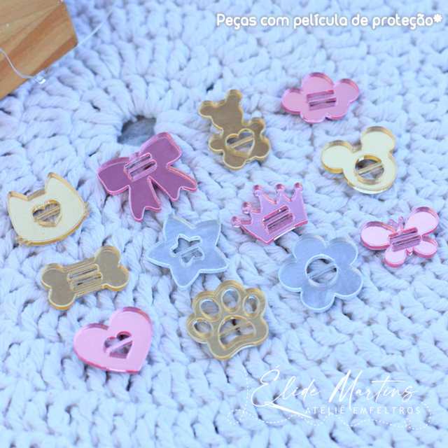 Recortes passante em acrílico espelhado - 10 unidades - Elastico 7mm - Gato-Laço-Urso-Nuvem-Osso-Estrela-Coroa-Mickey-Coração-Patinha-Flor-Borboleta