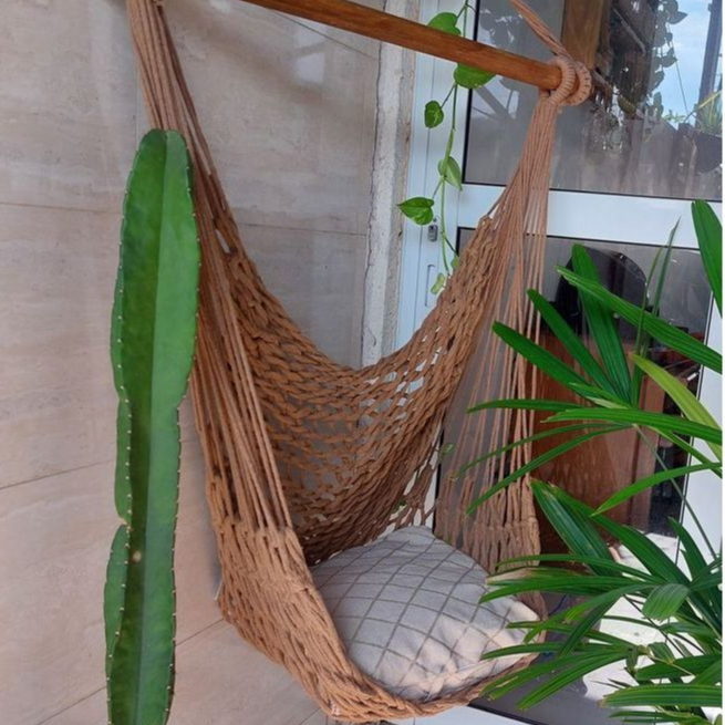 Rede Cadeira para Descanso TRANÇADA - 1º LINHA Essa é uma rede cadeira super confortável, decorativa e de fácil instalação, ela é perfeita para pequenos espaços e ótima para deixar seu ambiente mais aconchegante e bonito. Detalhes: Material: Algodão Cru Modelo Trançada Cor: Escolher no anúncio Dimensões: 1,50m de altura (aberta) x 0,85m de largura Tamanho da Madeira: Capacidade Máxima de Carga: 120 Kg Peso aproximado: 2,4 Kg Acompanha suporte em madeira e embalagem plástica para transporte. Obs: Não acompanha almofadas Produto com Nota Fiscal e enviado em até 2 dias úteis após a compra!