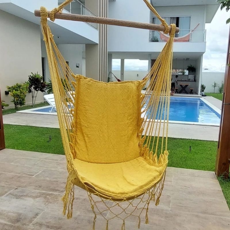 rede cadeira de balanço acolchoada capacidade máxima de carga: 120kg composição do tercido: 100% algodão composição da espuma: 100% polipropileno completo com a madeira nota fiscal dimensões: encosto: 60cm x 54cm assento: 52cm x 53cm suporte de madeira: 92cm