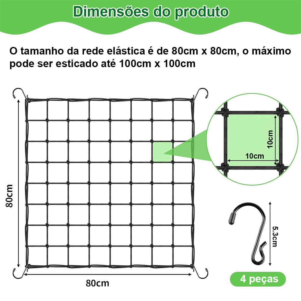 Nota: 1.Dentro do Conjunto Contém Uma rede de ramo de prensa elástica vegetal, equipada com 4 ganchos de ferro. 2.A Malha Elástica É 80cm, E Pode Ser Esticada Até 100cm X 100cm, E Pode Ser Esticada Até 100cm X 100cm. Descrição do produto: Reutilizável: A rede de ramo de imprensa elástica vegetal é feita em Material de fio elástico Super durável, equipado com 4 ganchos de ferro "S" Anti-ferrugem, o tamanho é de 80 cm X 80 cm, você pode dobrá-lo facilmente E coloque-o após o uso. Ajude o crescimento da planta: A rede de imprensa elástica garante que os ramos da planta, folhas e frutas sejam suficientes de luz e bom crescimento transverso, que podem suportar facilmente plantas de escalada pesadas, promover a alta produção de frutas, compatíveis Várias barracas de planta para usar. Se importa com A instalação: você pode facilmente envolver A malha elástica em torno de qualquer estrutura estável ou suporte com um gancho, não se preocupe com que ela solte facilmente. Grade quadrada grande: Cada grade mede 10cm X 10cm, com espaço suficiente para plantas para aparar e escolher através da grade. Ampla Aplicação: A Malha Elástica Pode Ser Fixa Em Vários Suportes de Crescimento Planta, Indicado Para Escalada Pesada Plantas de Videira Como Pepinos, Ervilhas, Amora, Cantaloupes, Tomates, Etc., Em Adição, Pode Também Ser Usado Como Rede de bagagem de carro forte.