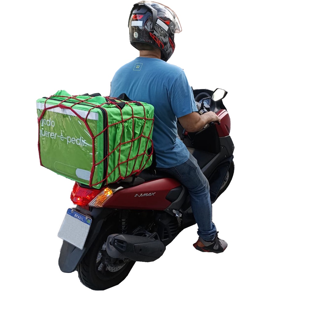 Rede ARANHAFIX para Mochila Delivery fabricada com fios de borracha revestidos com 16 fios de polipropileno. Extremamente resistente. Alivia peso das costas do entregador e elimina necessidade de colocar a mochila no chão. Conteúdo: 1x Rede Elástica ARANHAFIX de 60x40cm; 8x Ganchos reguláveis que podem ser posicionados conforme o bagageiro da motocicleta. Elasticidade média: 100% Produto Original ARANHAFIX. Qualidade desde 1979. Estamos à disposição. Tire suas dúvidas.